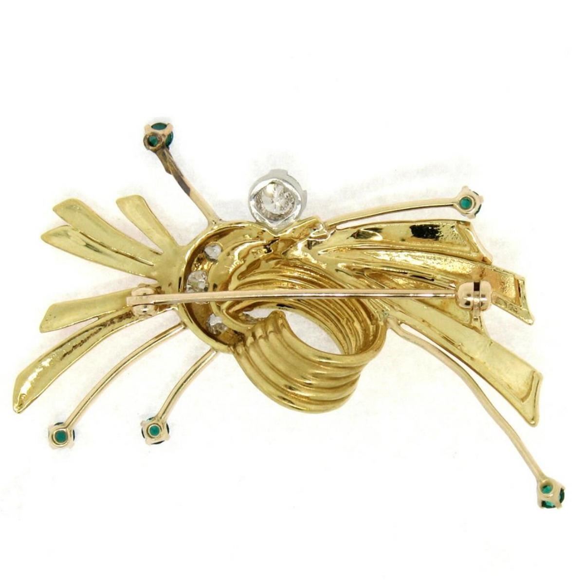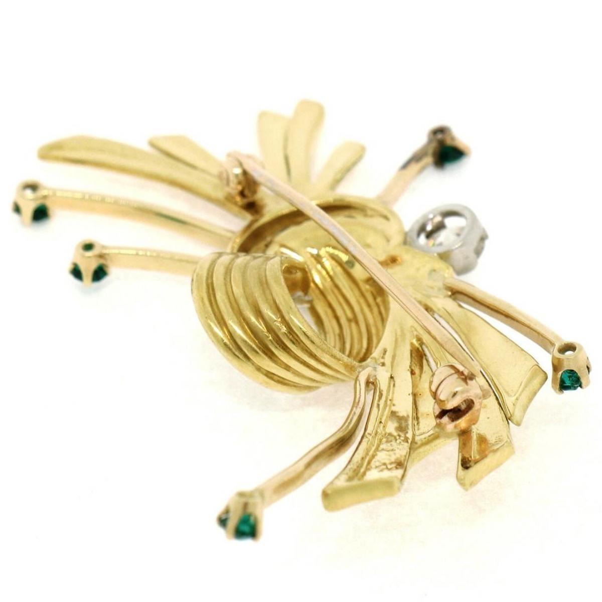 A vintage solid 18k two tone gold brooch with a larger, prong set, old European cut natural diamond (G - VS2; 0.35ct) accented by 4 smaller, bead set, old mine and European cut natural diamonds (H/I - VS2/SI1; 0.37ctw) and 5 prong set round synthetic emeralds. Measures 35.5x49.6mm and weighs a total of 9.98 grams.
