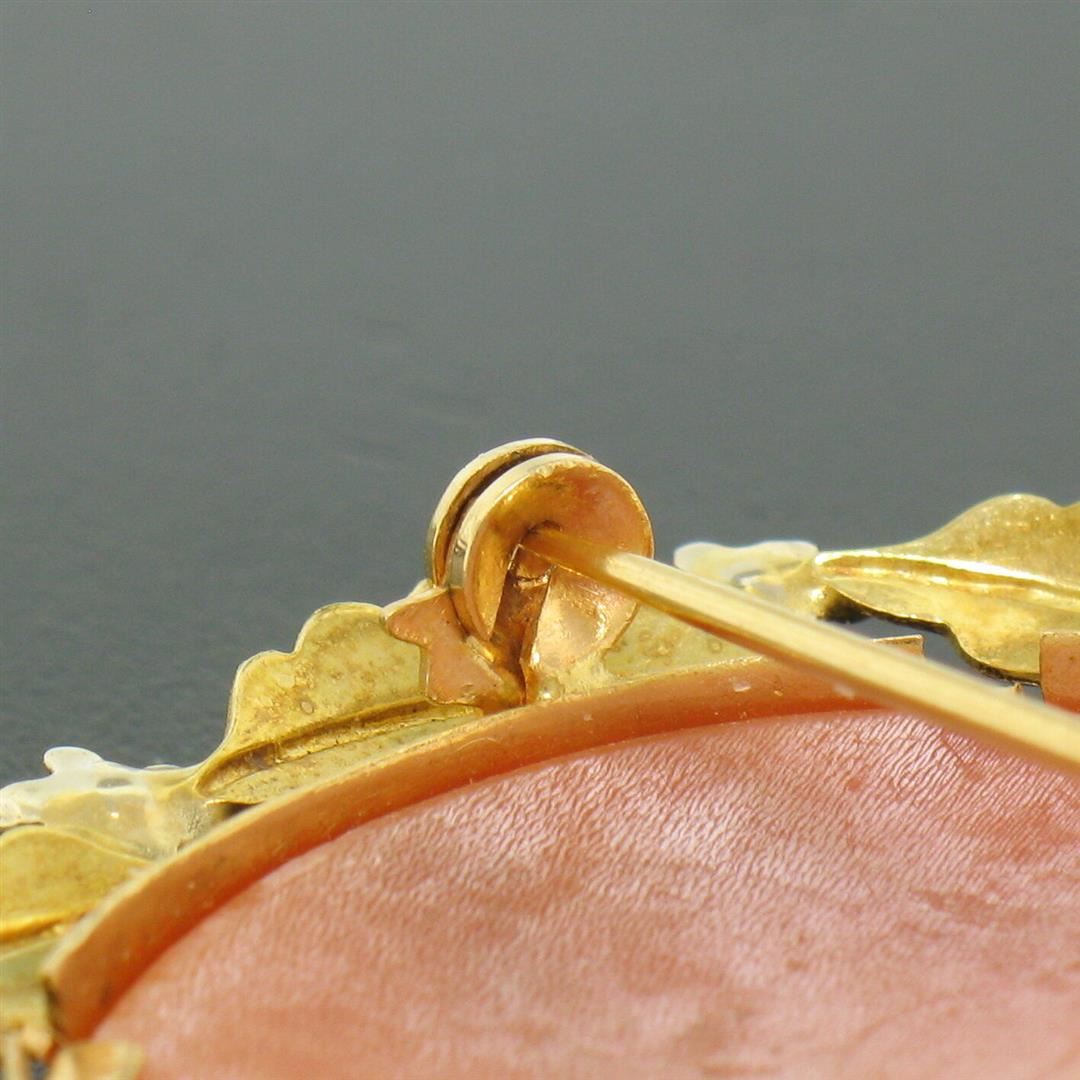 A vintage solid 18k yellow and white gold brooch or pendant, featuring 1 oval shape natural carved shell cameo (30.55x23.75mm). Measures 44.81x36.3mm and weighs a total of 11.0 grams.