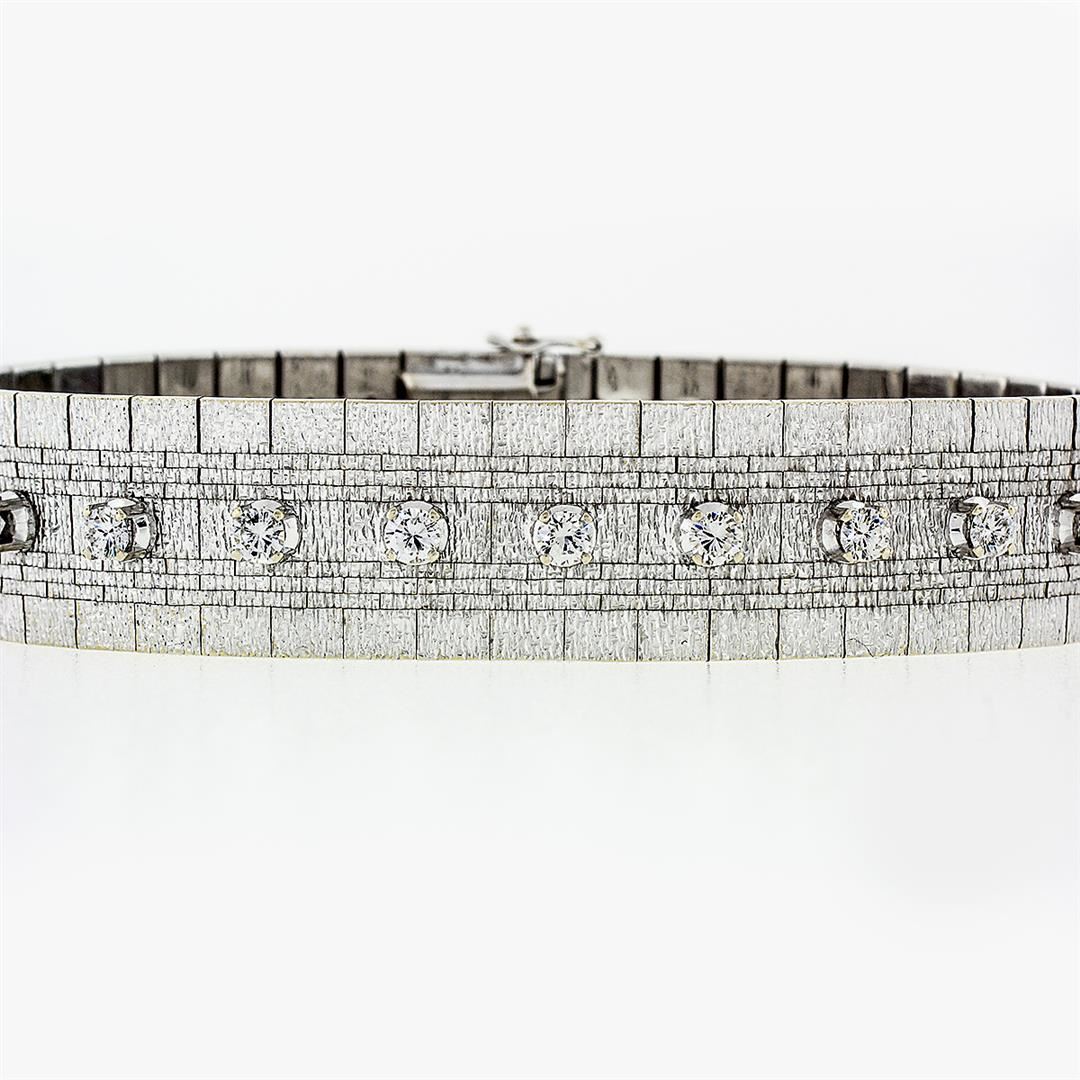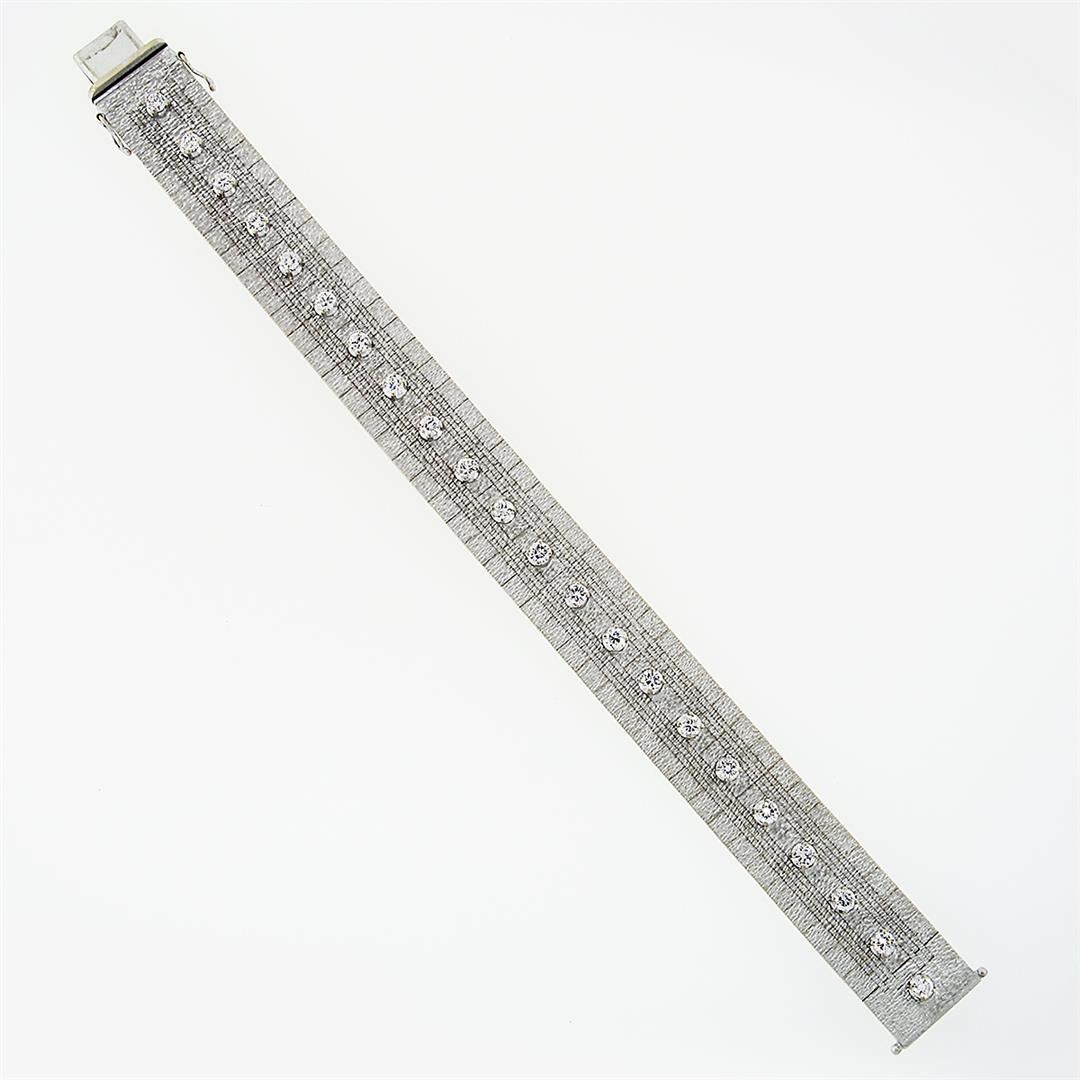 A solid 18k white gold mesh link bracelet, with 22 round brilliant cut natural diamonds (F/G - VS1/VS2 ; 2.40ctw ). It weighs a total of 60.66 grams, measures 15.17mm wide, and measures 7.25 inches in length.
