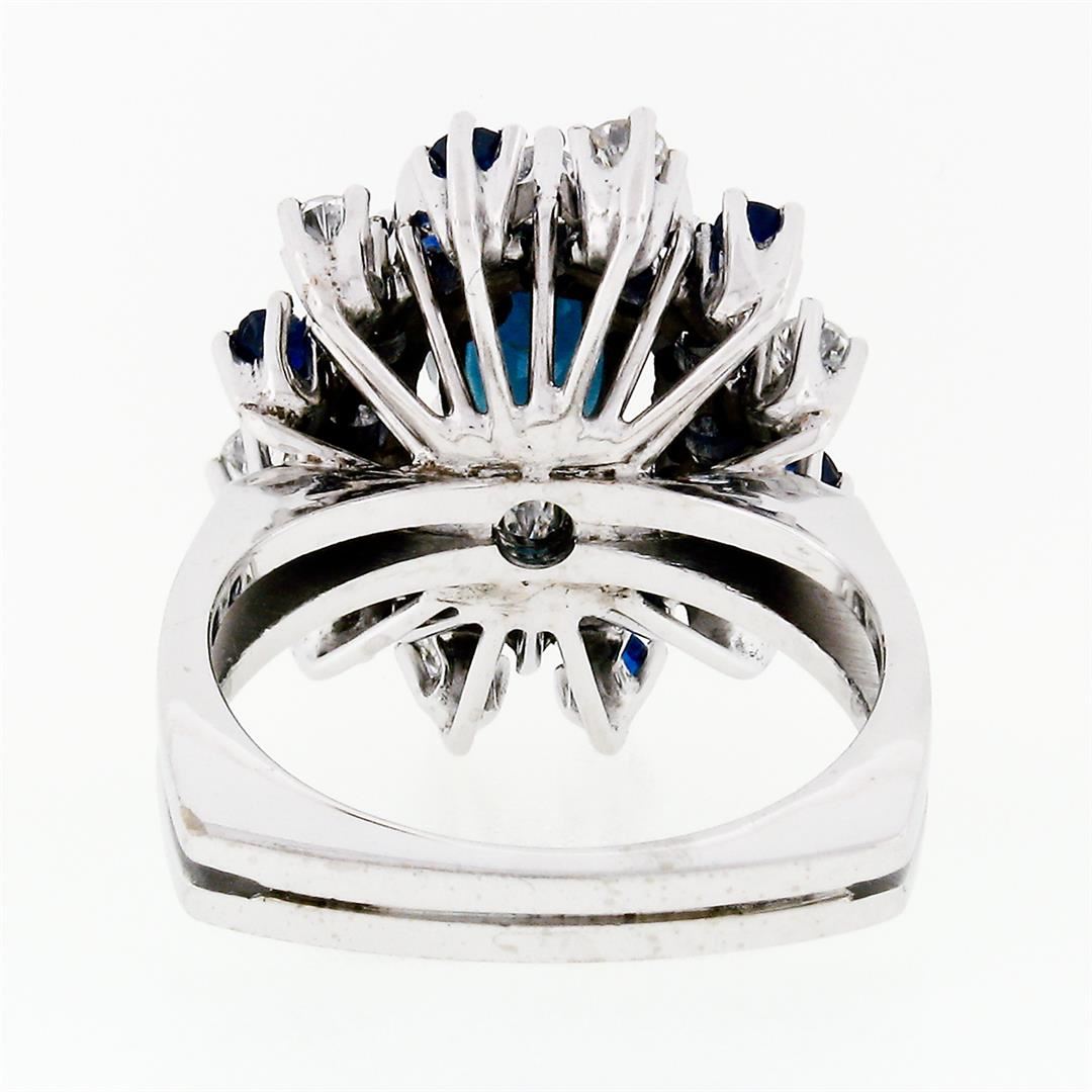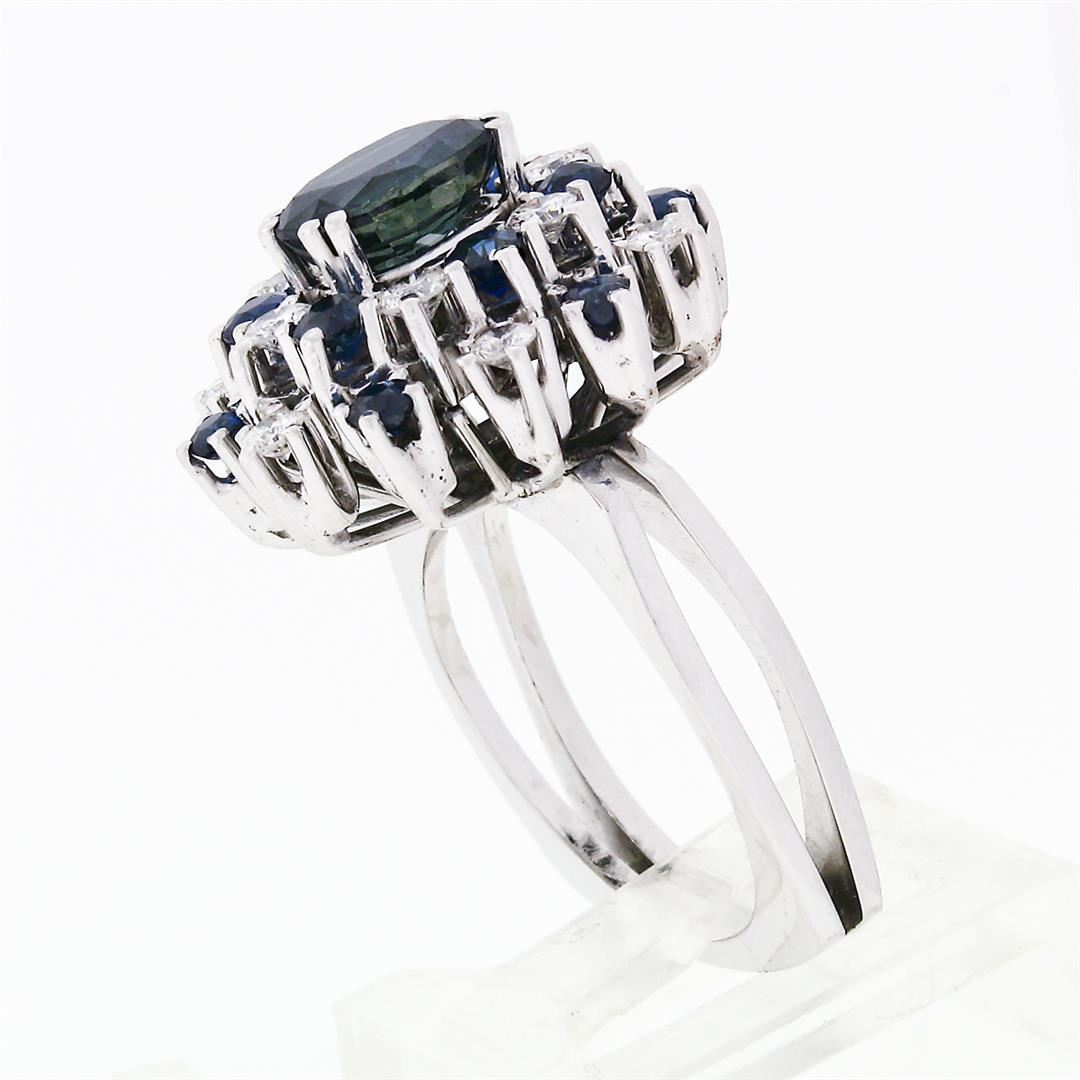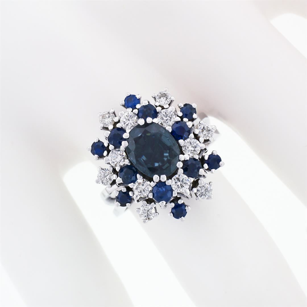 A vintage 18k white gold cocktail ring with 1 oval brilliant cut natural sapphire (1.55ct) surrounded with 12 round cut natural sapphires (1.10ctw) and 12 round brilliant cut natural diamonds (F/G - VS1; 0.50ctw). The ring is size 6.0, weighs a total of 9.44 grams, and measures 18.52mm wide.