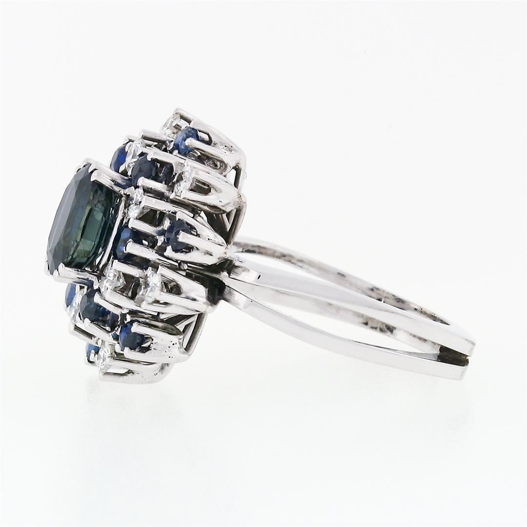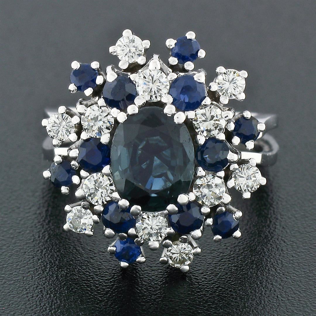 A vintage 18k white gold cocktail ring with 1 oval brilliant cut natural sapphire (1.55ct) surrounded with 12 round cut natural sapphires (1.10ctw) and 12 round brilliant cut natural diamonds (F/G - VS1; 0.50ctw). The ring is size 6.0, weighs a total of 9.44 grams, and measures 18.52mm wide.