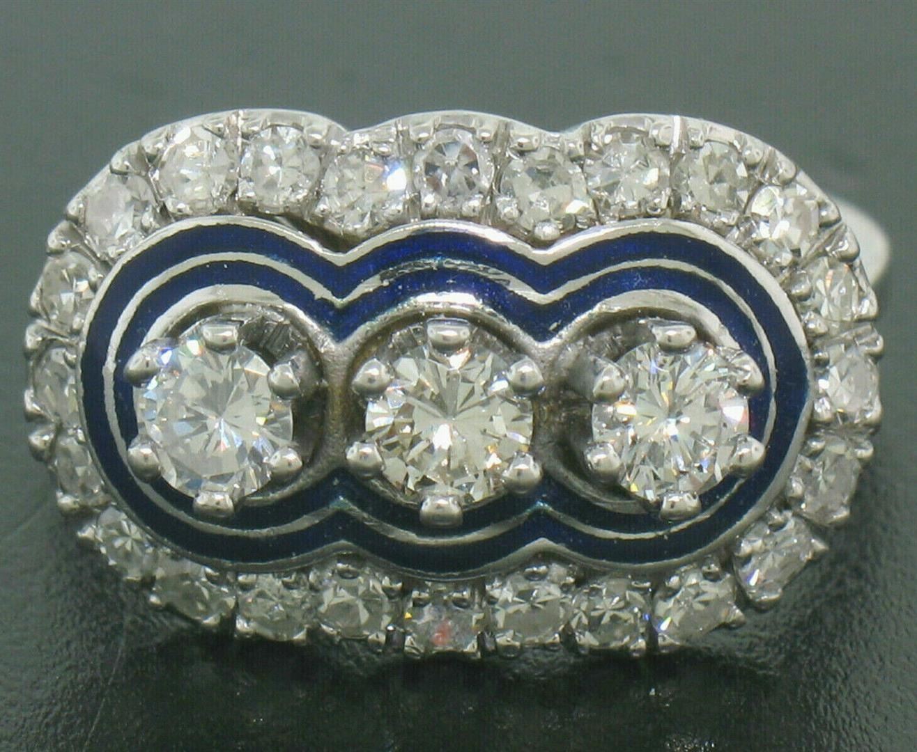 A like new vintage 18k white gold ring with 1.15ctw of round diamonds (G - VS2) and blue enamel. The ring is size 6.5, weighs a total of 6.1 grams, and the top measures approximately 19.53x12.58mm.