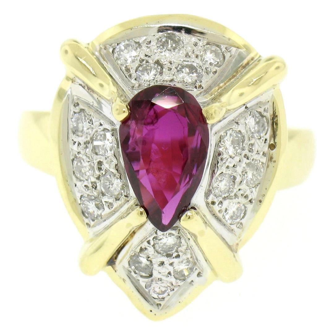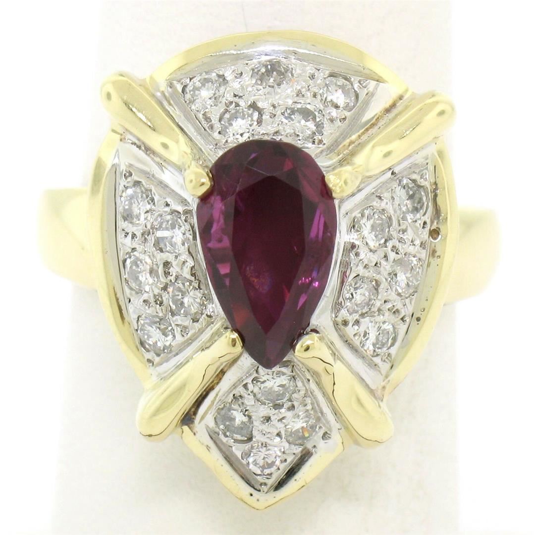 A vintage 18k yellow and white gold cocktail ring featuring a 2.20ct pear cut ruby surrounded by 0.78ctw of round brilliant diamonds (G/H - VS2/SI1). The ring is size 7.0, weighs a total of 11.61 grams, and measures 20.90mm wide.