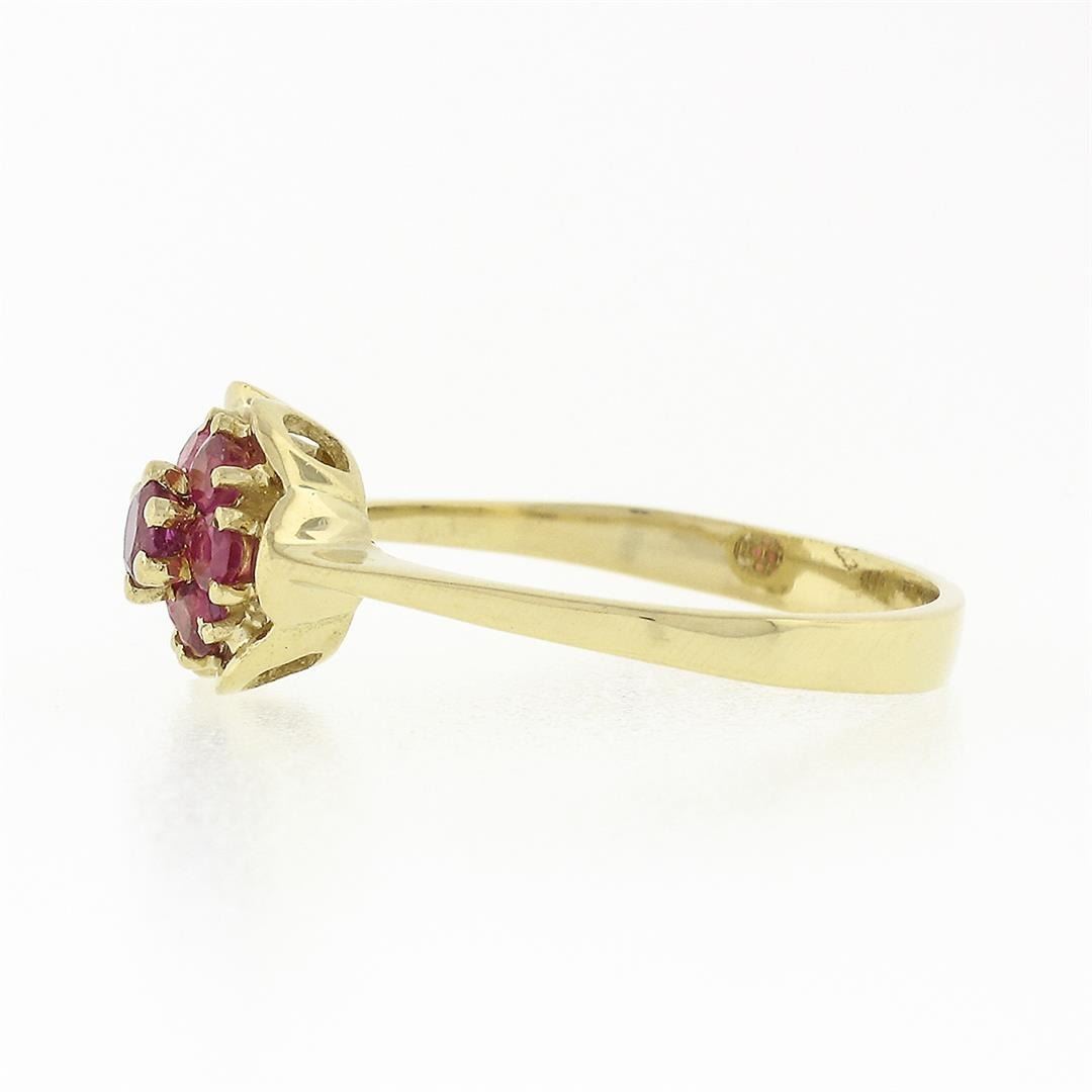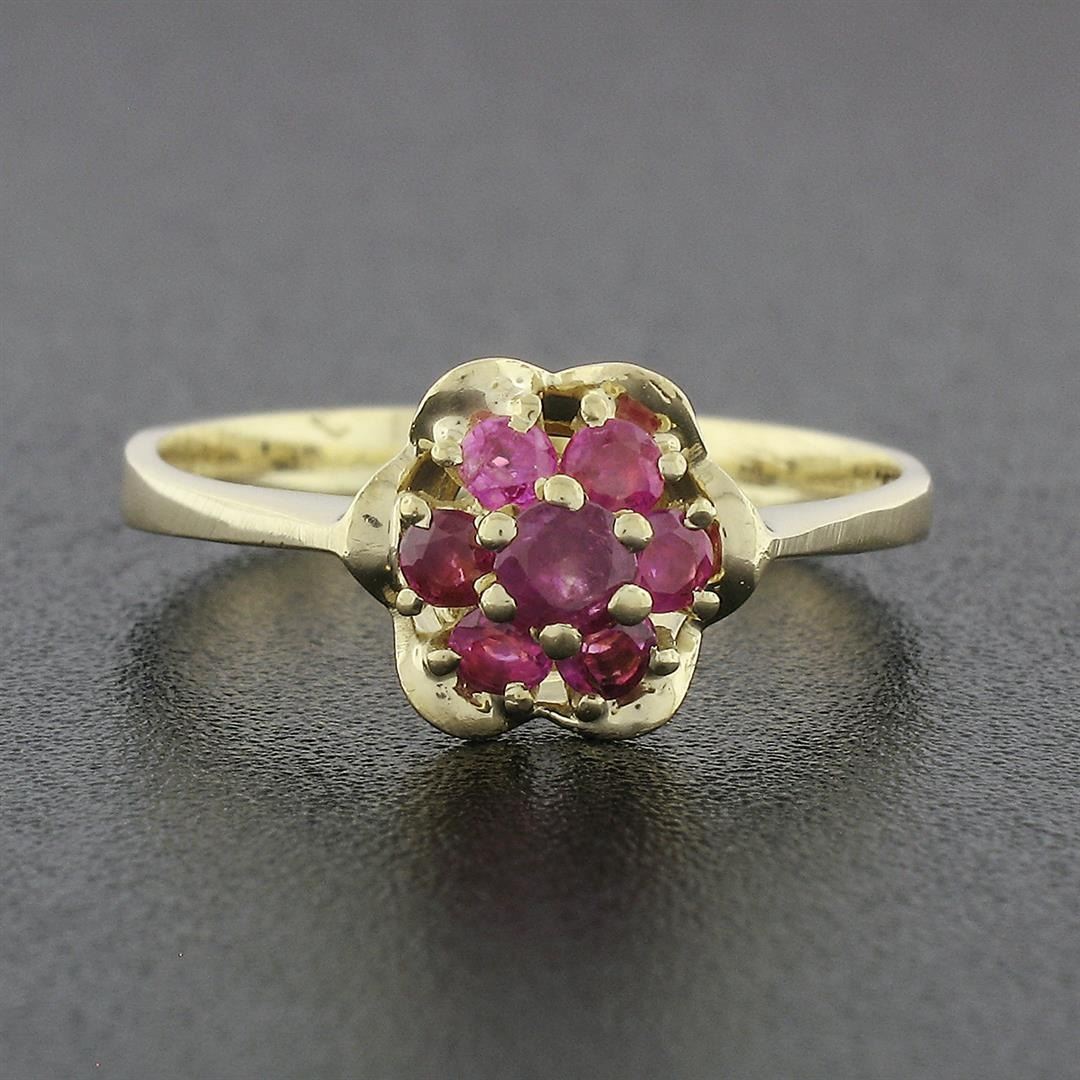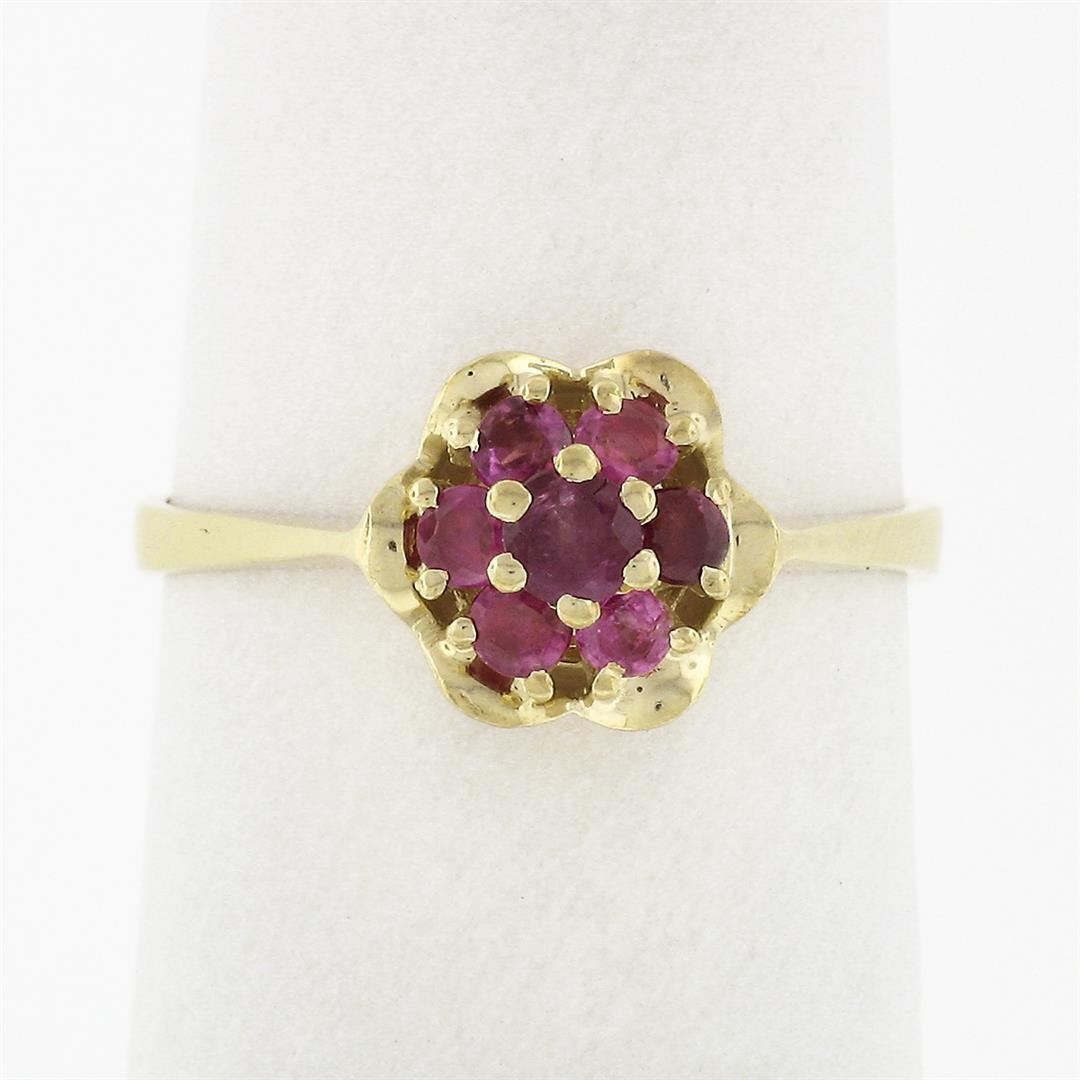 A vintage solid 18k yellow gold flower ring, featuring 7 round brilliant cut natural rubies (0.37ctw).The ring is size 5.5, weighs a total of 2.49 grams, and measures 8.15mm wide.
