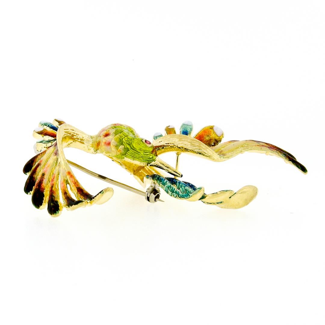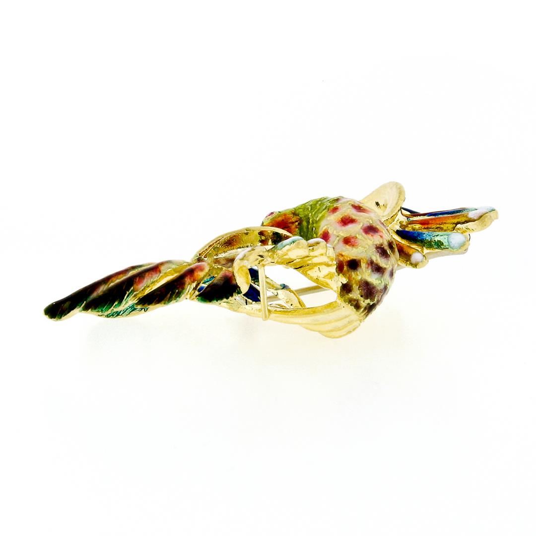 A vintage solid 18k yellow gold flying peacock pin brooch, with multicolor enamel work and 1 round brilliant cut natural diamond (0.03ctw). Measures 50x56.6mm and weighs a total of 19.39 grams.
