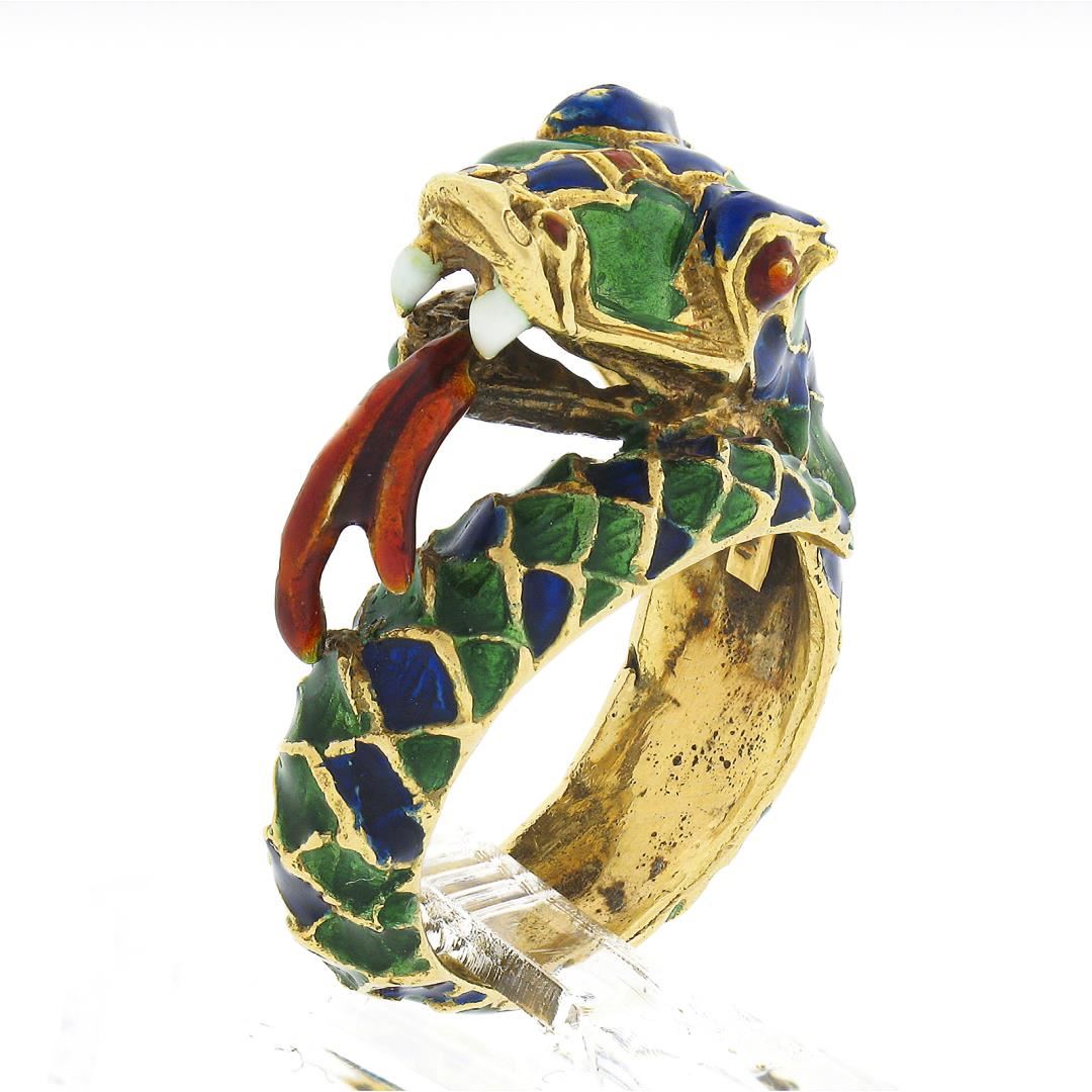 A vintage solid 18k yellow gold and enamel snake wrap ring. The ring is size 6.5, weighs a total of 10.76 grams, and measures 13.5mm wide.