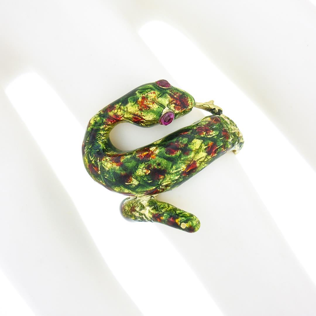 A vintage solid 18k yellow gold multicolor enamel work wrap wring, with 2 round cut red stones. The ring is size 4.5, weighs a total of 8.62 grams, and measures 20.20mm wide.