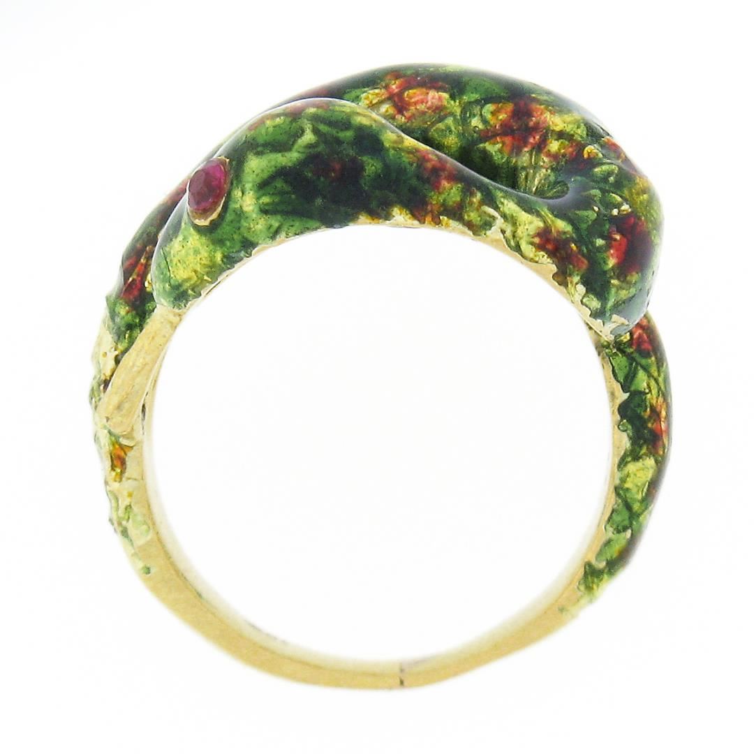A vintage solid 18k yellow gold multicolor enamel work wrap wring, with 2 round cut red stones. The ring is size 4.5, weighs a total of 8.62 grams, and measures 20.20mm wide.