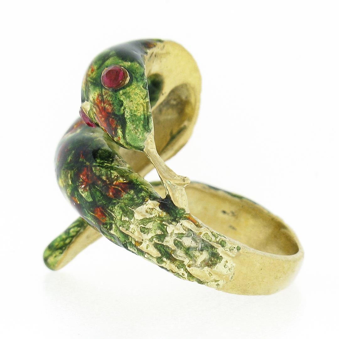 A vintage solid 18k yellow gold multicolor enamel work wrap wring, with 2 round cut red stones. The ring is size 4.5, weighs a total of 8.62 grams, and measures 20.20mm wide.
