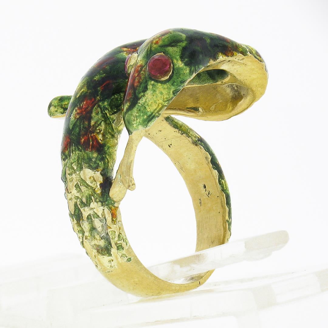 A vintage solid 18k yellow gold multicolor enamel work wrap wring, with 2 round cut red stones. The ring is size 4.5, weighs a total of 8.62 grams, and measures 20.20mm wide.