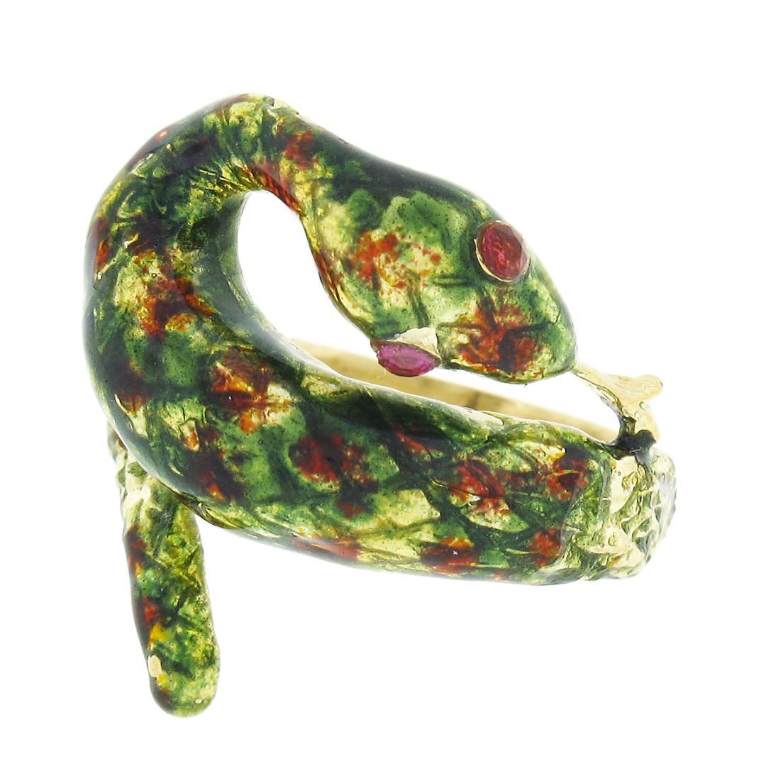 A vintage solid 18k yellow gold multicolor enamel work wrap wring, with 2 round cut red stones. The ring is size 4.5, weighs a total of 8.62 grams, and measures 20.20mm wide.