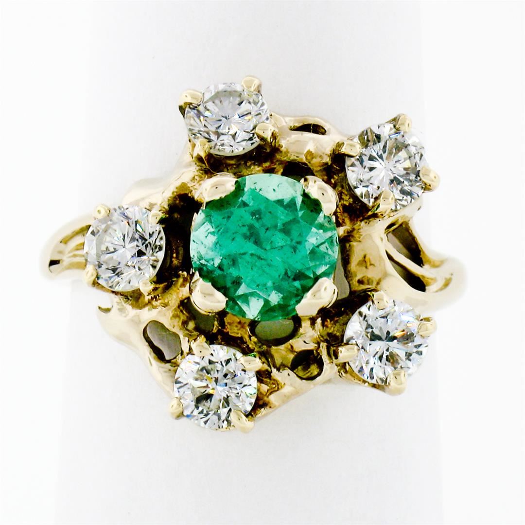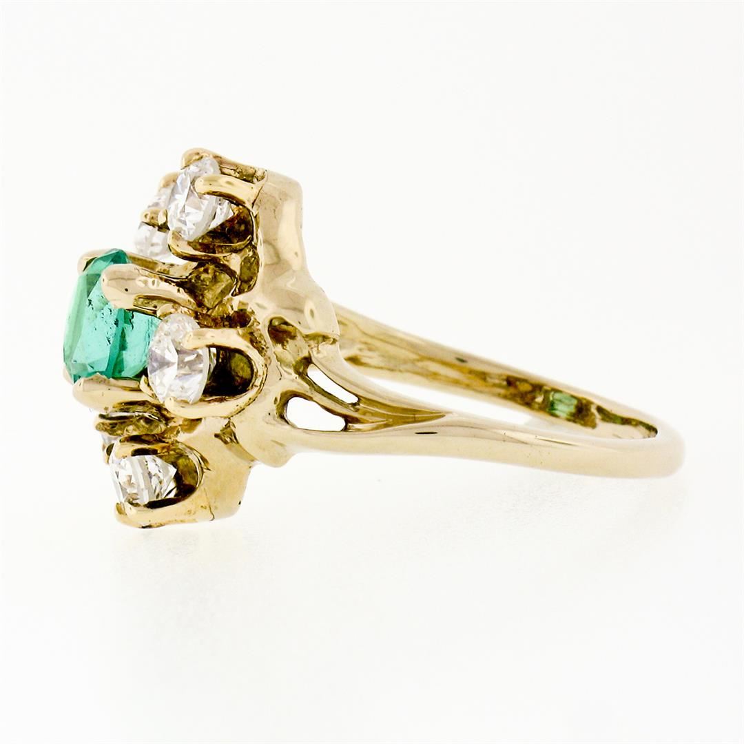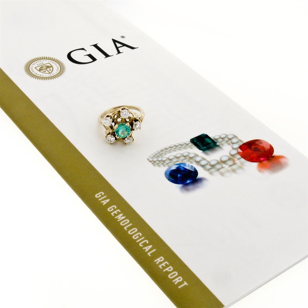 A vintage solid 18k yellow gold flower ring, with 1 GIA Certified round brilliant cut natural emerald (6.43 to 6.47 ; 0.93ct), surrounded with 5 round brilliant cut natural diamonds (G/H - VVS2/VS1 ; 1.10ctw). The ring is size 6.5, weighs a total of 5.93 grams, and measures 15.86mm wide. Comes with all original relevant certifications.