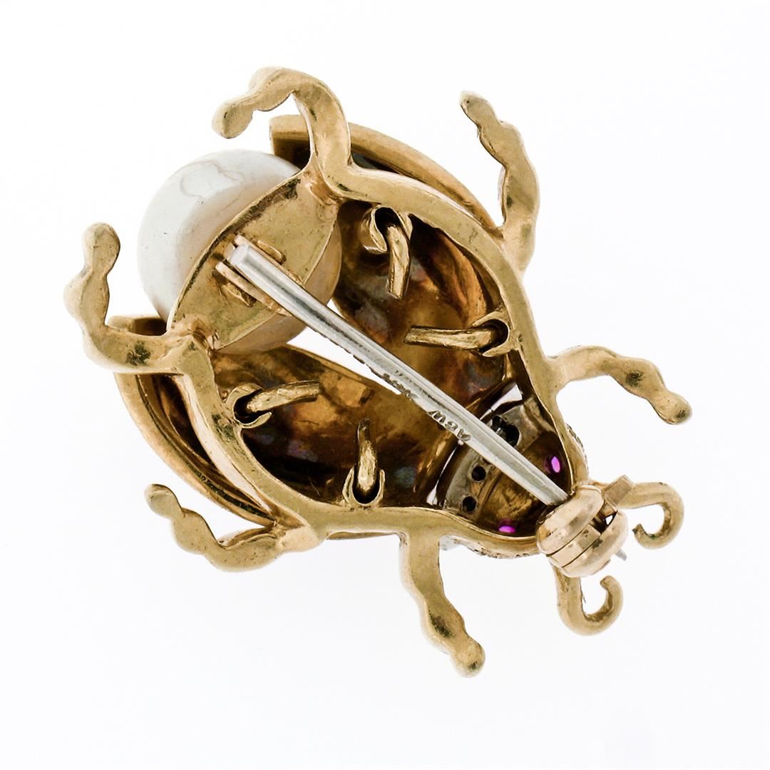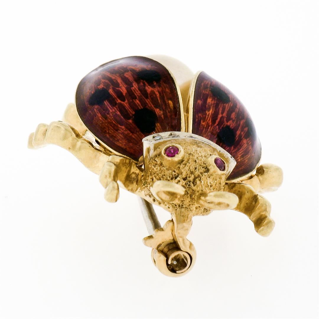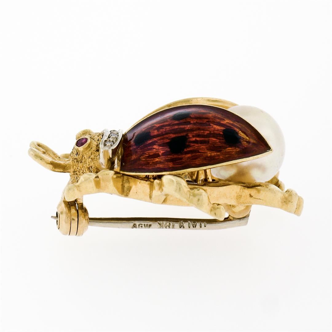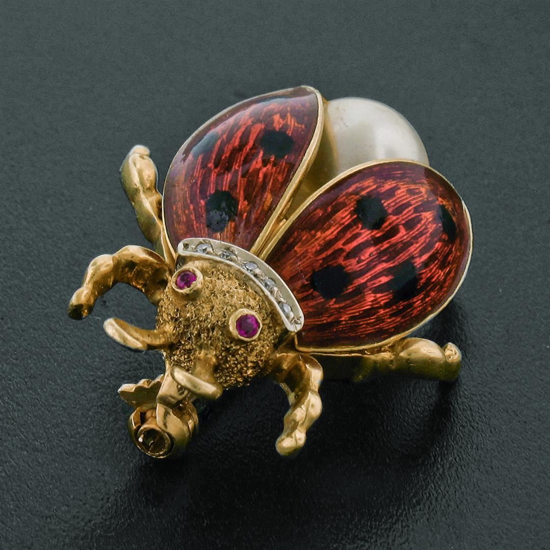 A vintage 18k gold ladybug pin/brooch featuring red and black enamel, 2 round cabochon rubies (0.02ctw) for eyes, 5 round single cut diamonds (0.03ctw; G - VS2), and an 8.0mm round cultured pearl. Measures 28.0x21.8mm and weighs a total of 8.86 grams.