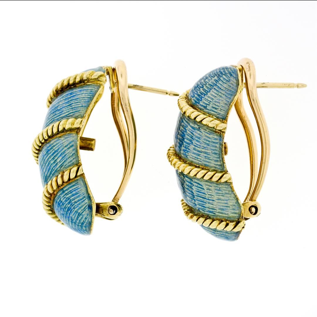 A pair of vintage, textured, solid 18k yellow gold domed earrings covered with baby blue enamel. The earrings measure approximately 28x16.8mm and weigh a total of 19.41 grams.