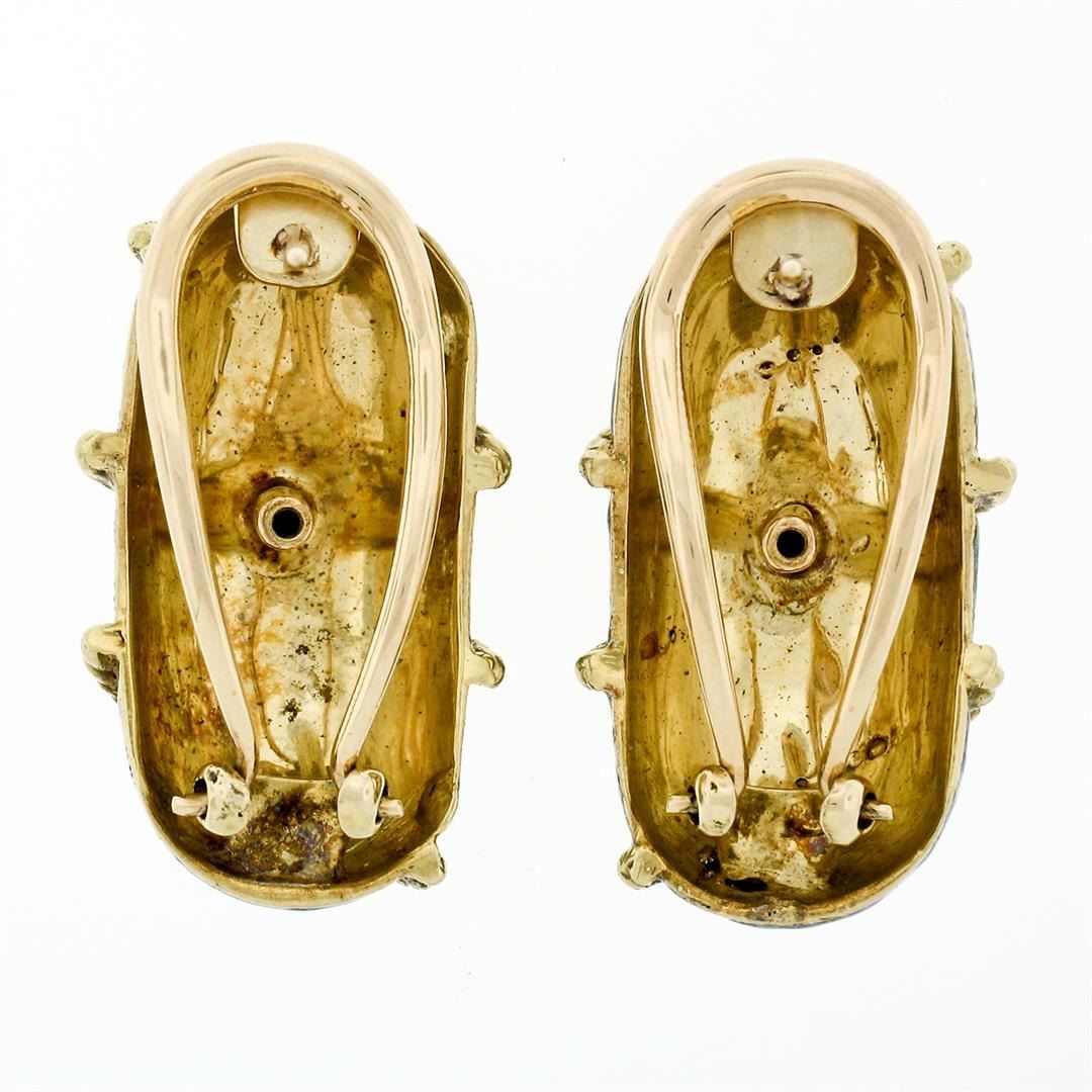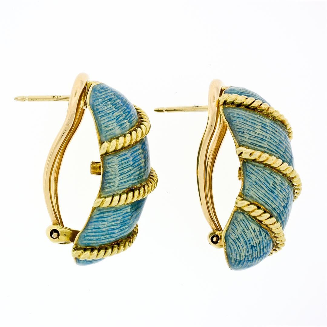 A pair of vintage, textured, solid 18k yellow gold domed earrings covered with baby blue enamel. The earrings measure approximately 28x16.8mm and weigh a total of 19.41 grams.