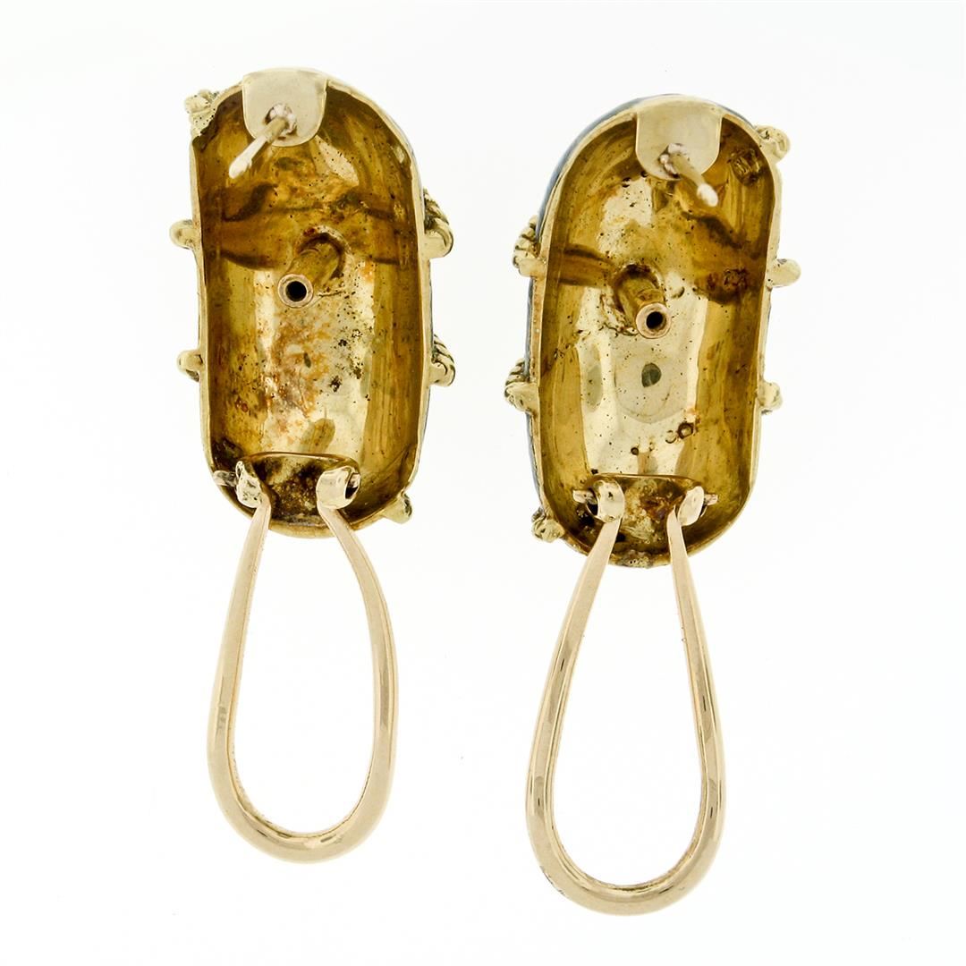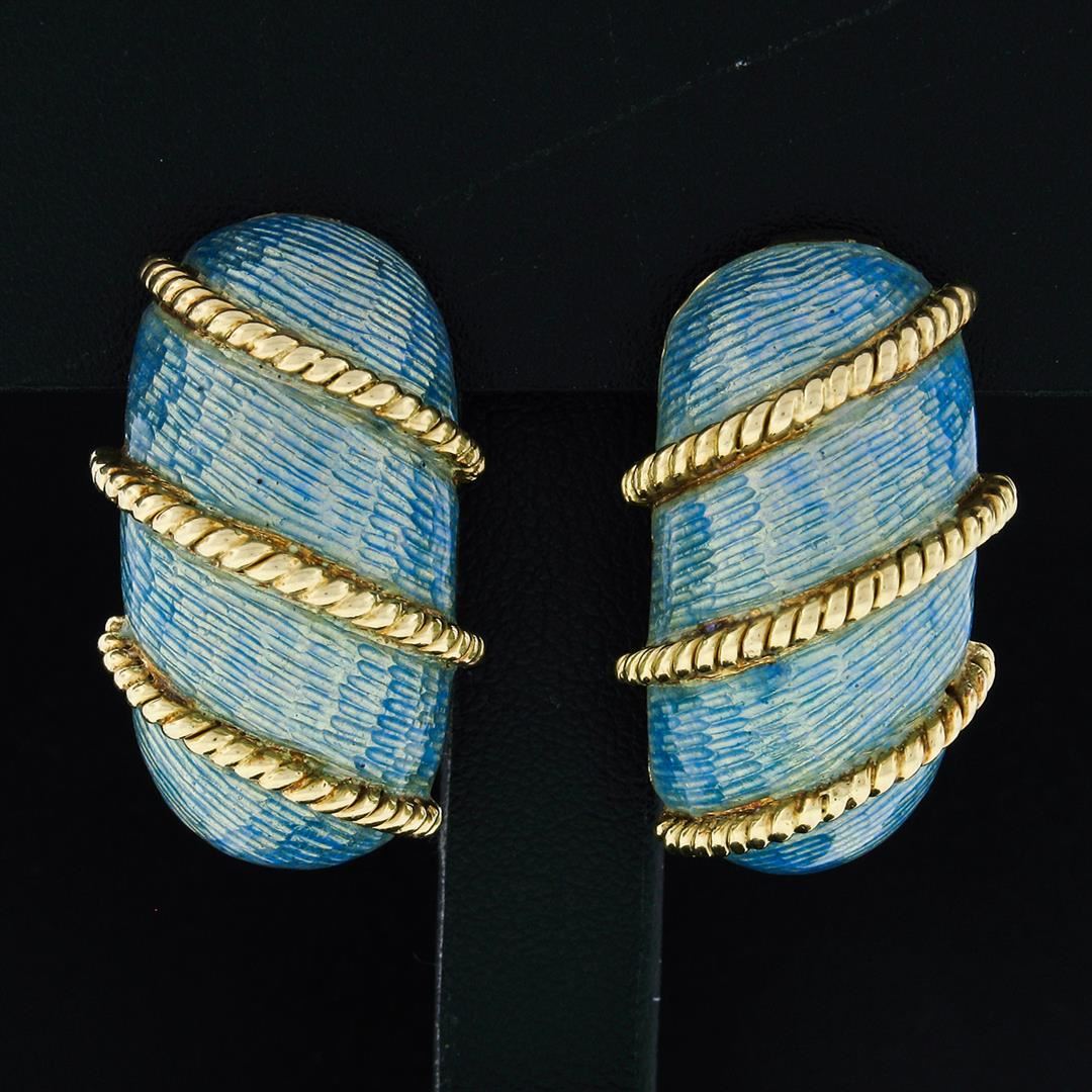 A pair of vintage, textured, solid 18k yellow gold domed earrings covered with baby blue enamel. The earrings measure approximately 28x16.8mm and weigh a total of 19.41 grams.