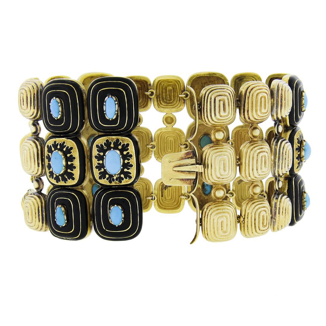 A vintage solid 18k yellow gold wide bracelet, with black enamel work & 15 oval cabochon cut natural turquoises. It weighs a total of 68.14 grams, measures 48.3mm wide, and measures 7.5 inches in length.