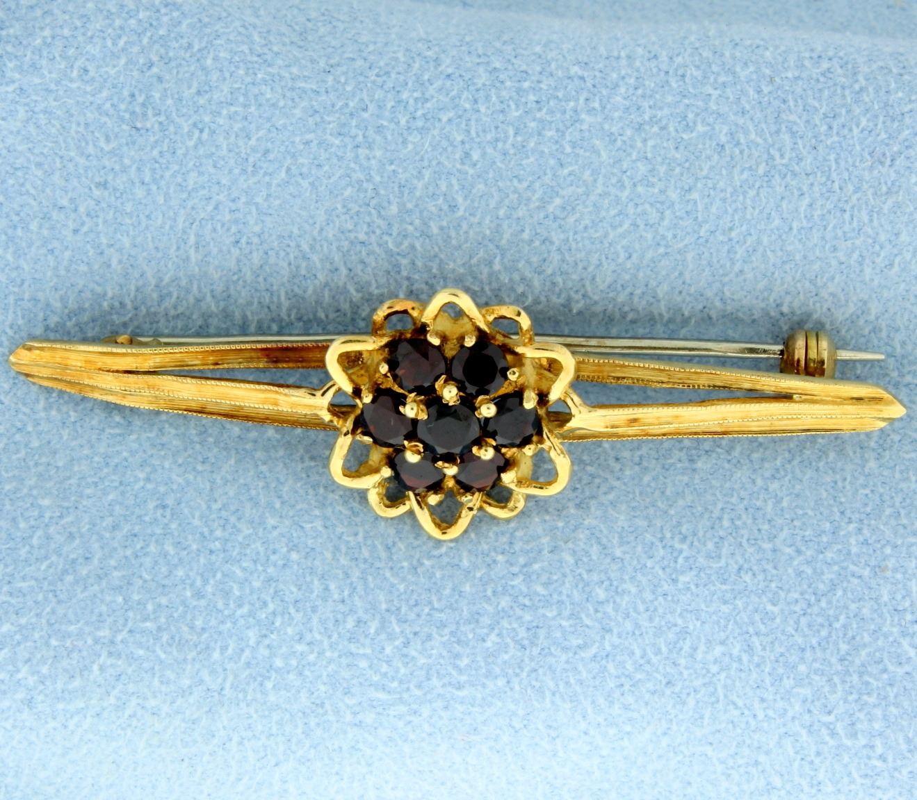 18k Yellow gold. Contains 7 round garnet gemstones totaling .75 carats. 2.25 inches long. 6.1g