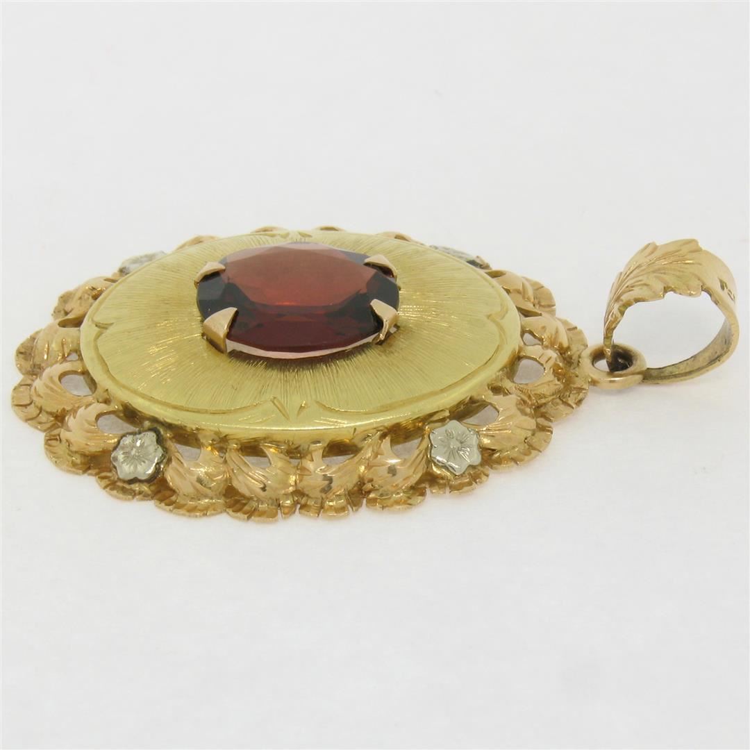 An excellent condition vintage 18k gold pendant with a 3.42ct oval cut garnet prong set over a yellow gold centerpiece that is surrounded by an open rose gold frame which is accented by four white gold flowers. The pendant weighs a total of 6.47 grams, measures 44.95x27.50mm including the bail, and the inside of the bail measures 7.8x6.3mm.