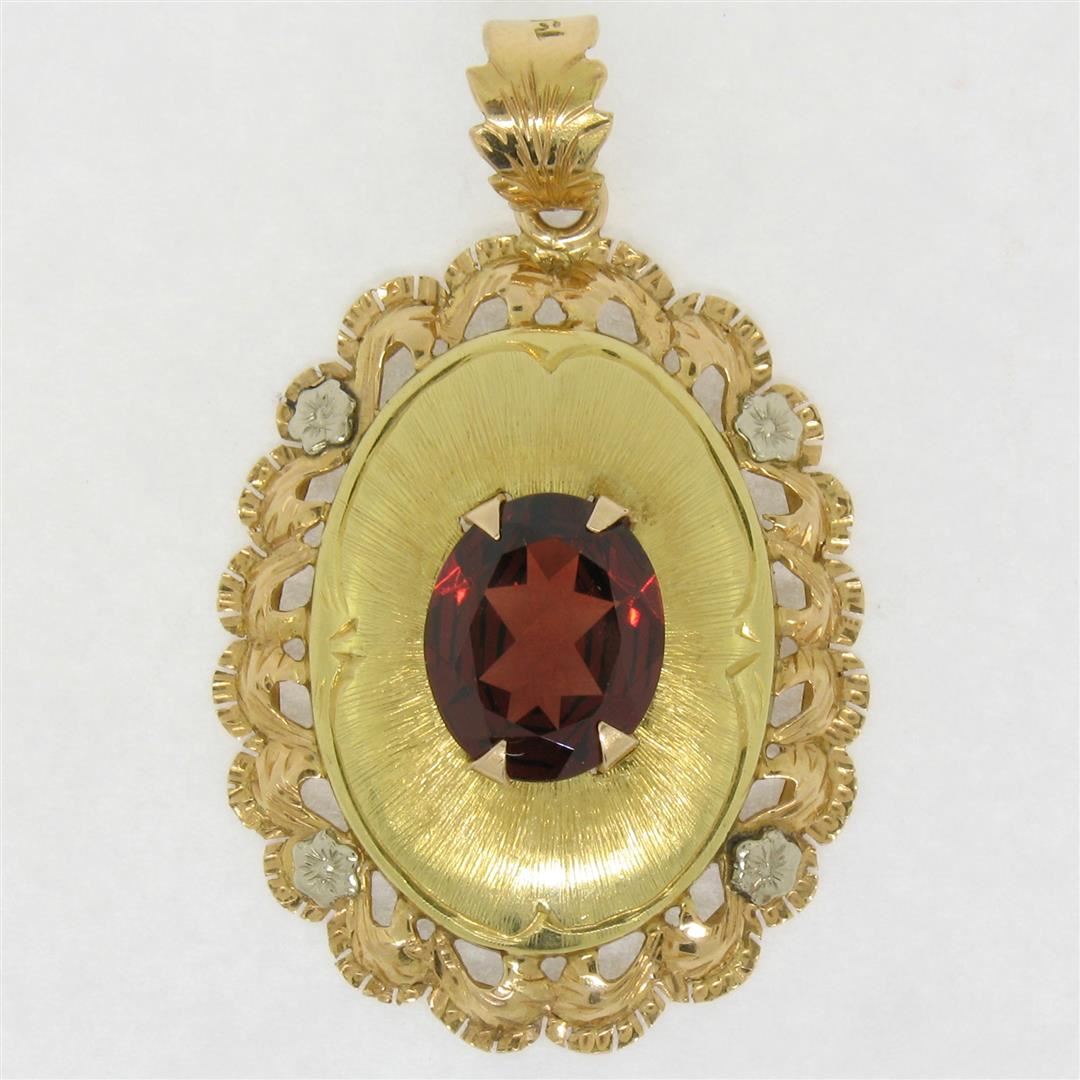 An excellent condition vintage 18k gold pendant with a 3.42ct oval cut garnet prong set over a yellow gold centerpiece that is surrounded by an open rose gold frame which is accented by four white gold flowers. The pendant weighs a total of 6.47 grams, measures 44.95x27.50mm including the bail, and the inside of the bail measures 7.8x6.3mm.