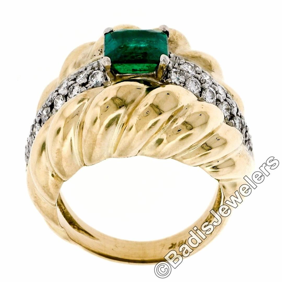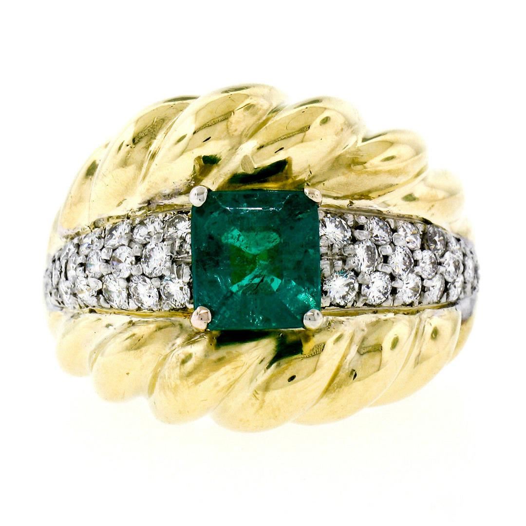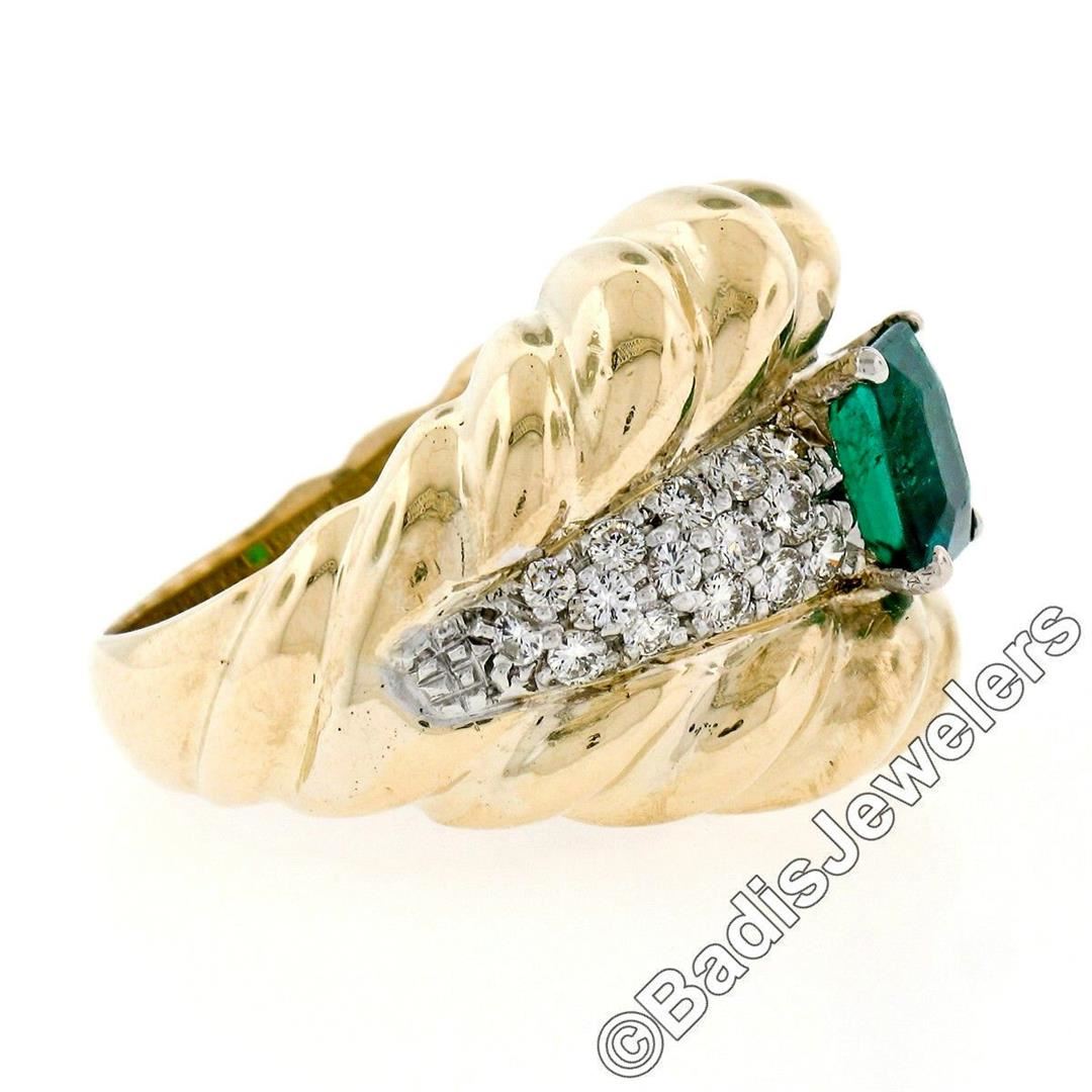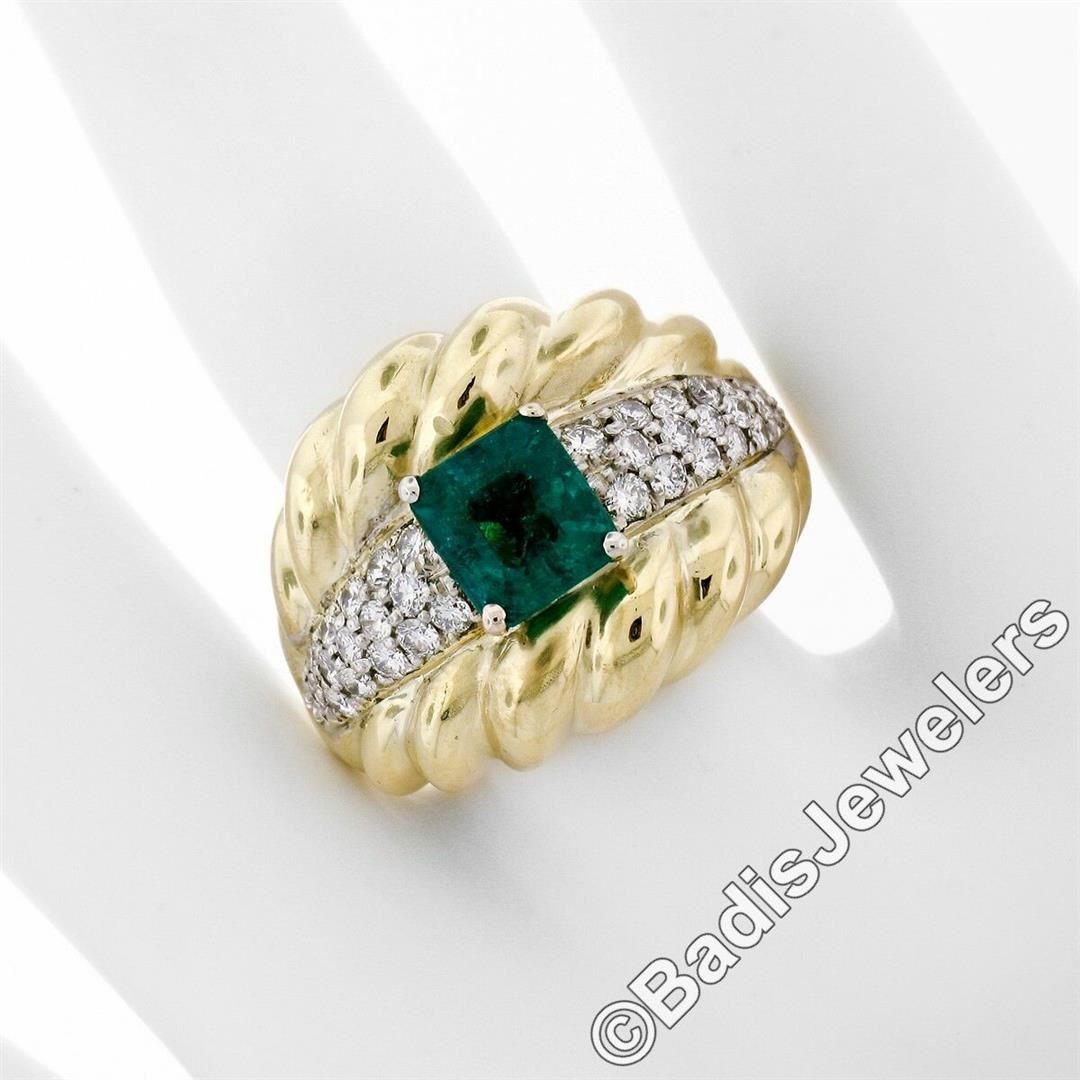 An 18kt gold cocktail ring featuring a GIA certified 1.59ct Colombian emerald accented by 0.70ctw of round brilliant diamonds(F/G - VS1/VS2). The ring is size 7.0, weighs a total of 16.33 grams, and measures 18.85mm wide. Comes with original GIA certification for the emerald.