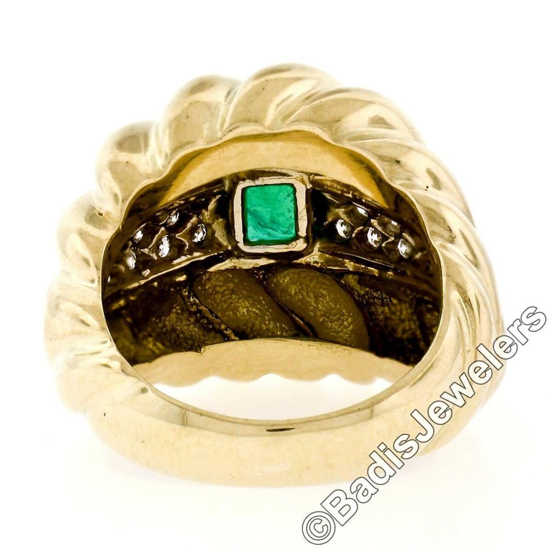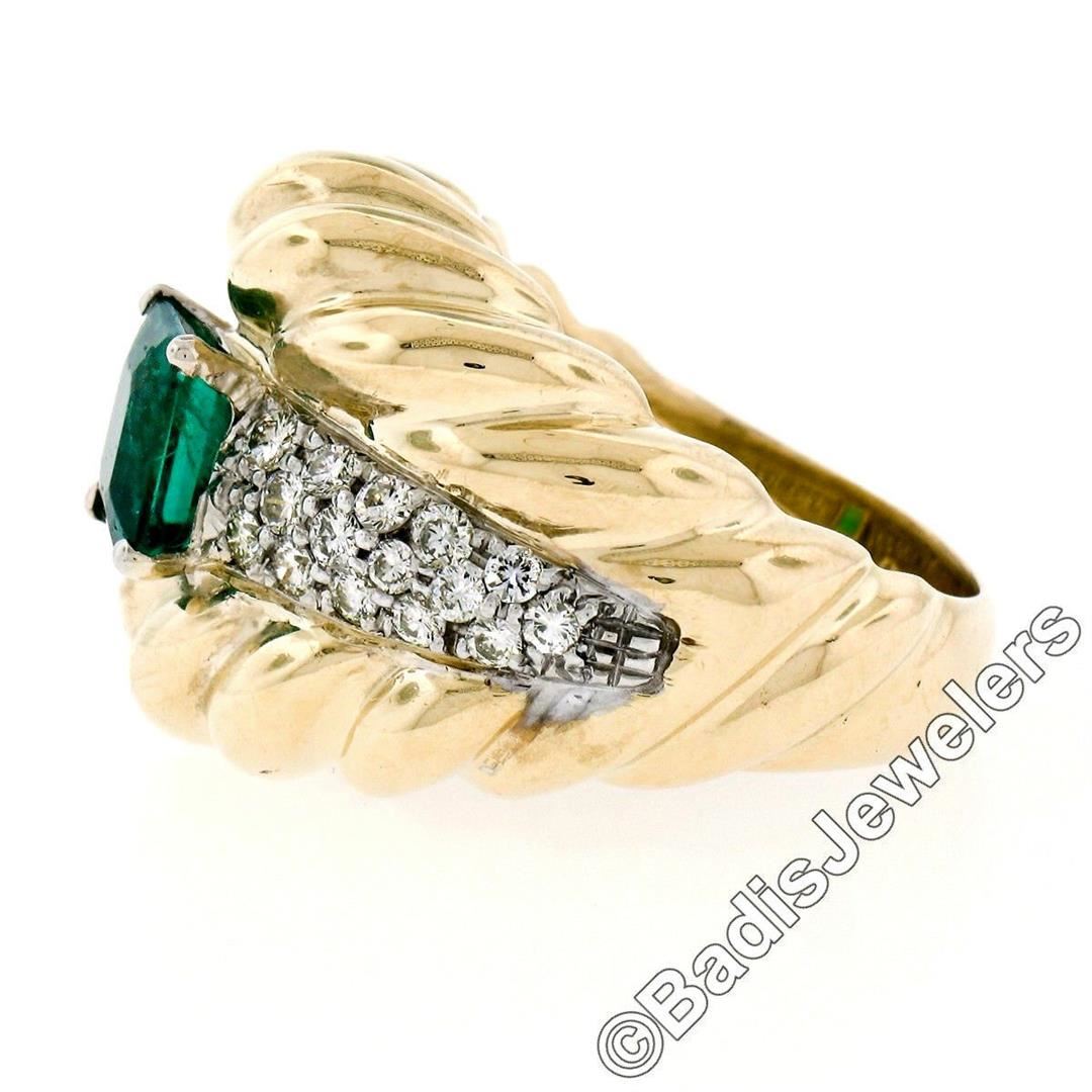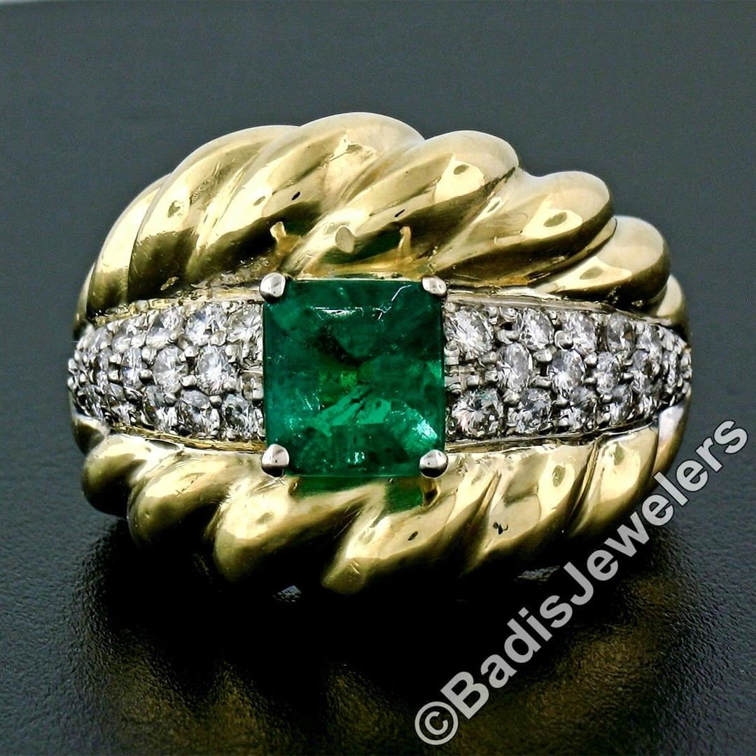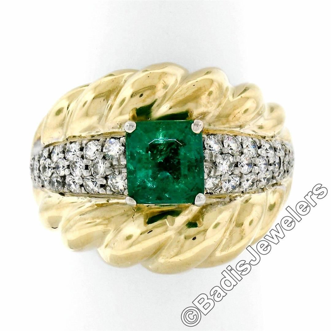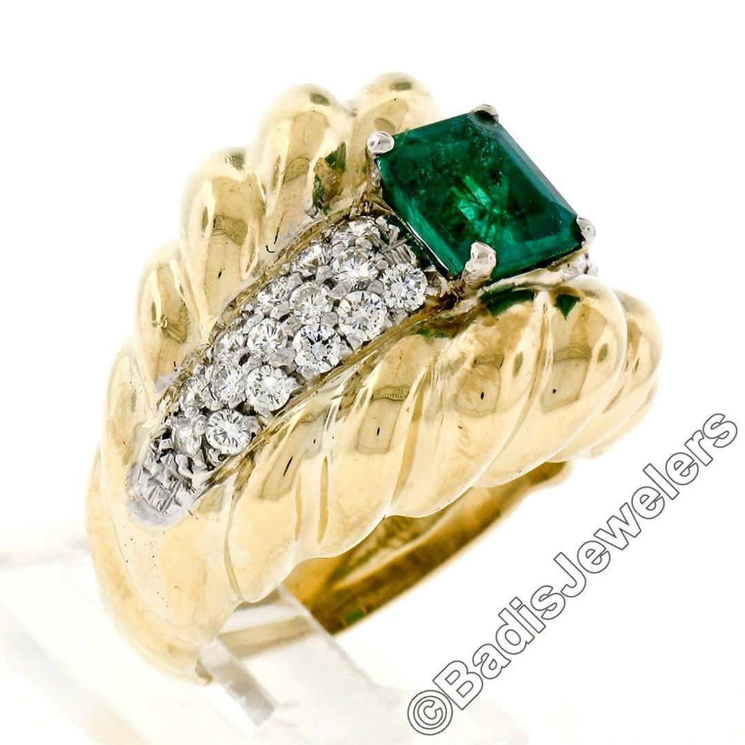 An 18kt gold cocktail ring featuring a GIA certified 1.59ct Colombian emerald accented by 0.70ctw of round brilliant diamonds(F/G - VS1/VS2). The ring is size 7.0, weighs a total of 16.33 grams, and measures 18.85mm wide. Comes with original GIA certification for the emerald.