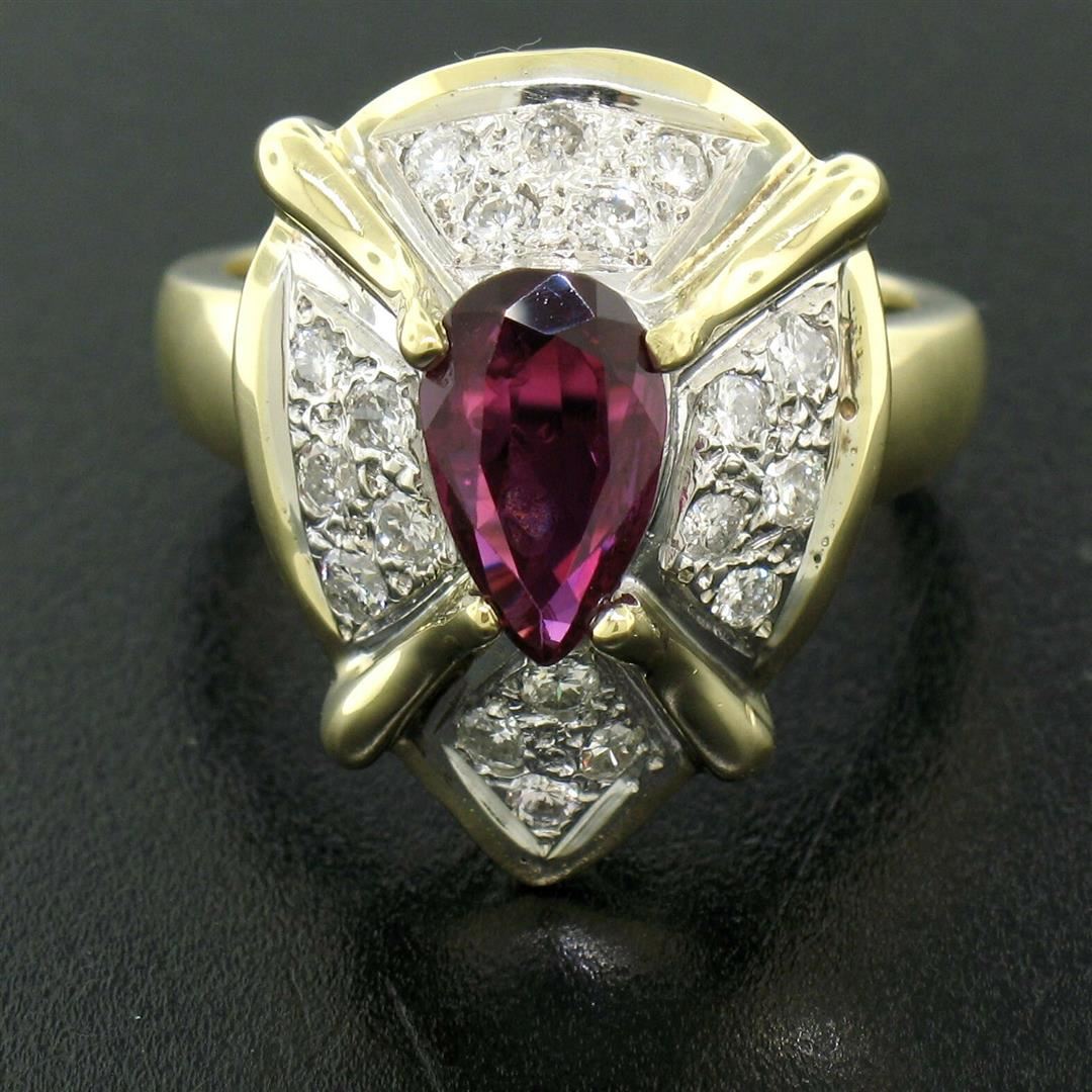 A vintage 18kt yellow and white gold cocktail ring featuring a 2.20ct pear cut ruby surrounded by 0.78ctw of round brilliant diamonds (G/H - VS2/SI1). The ring is size 7.0, weighs a total of 11.61 grams, and measures 20.90mm wide.
