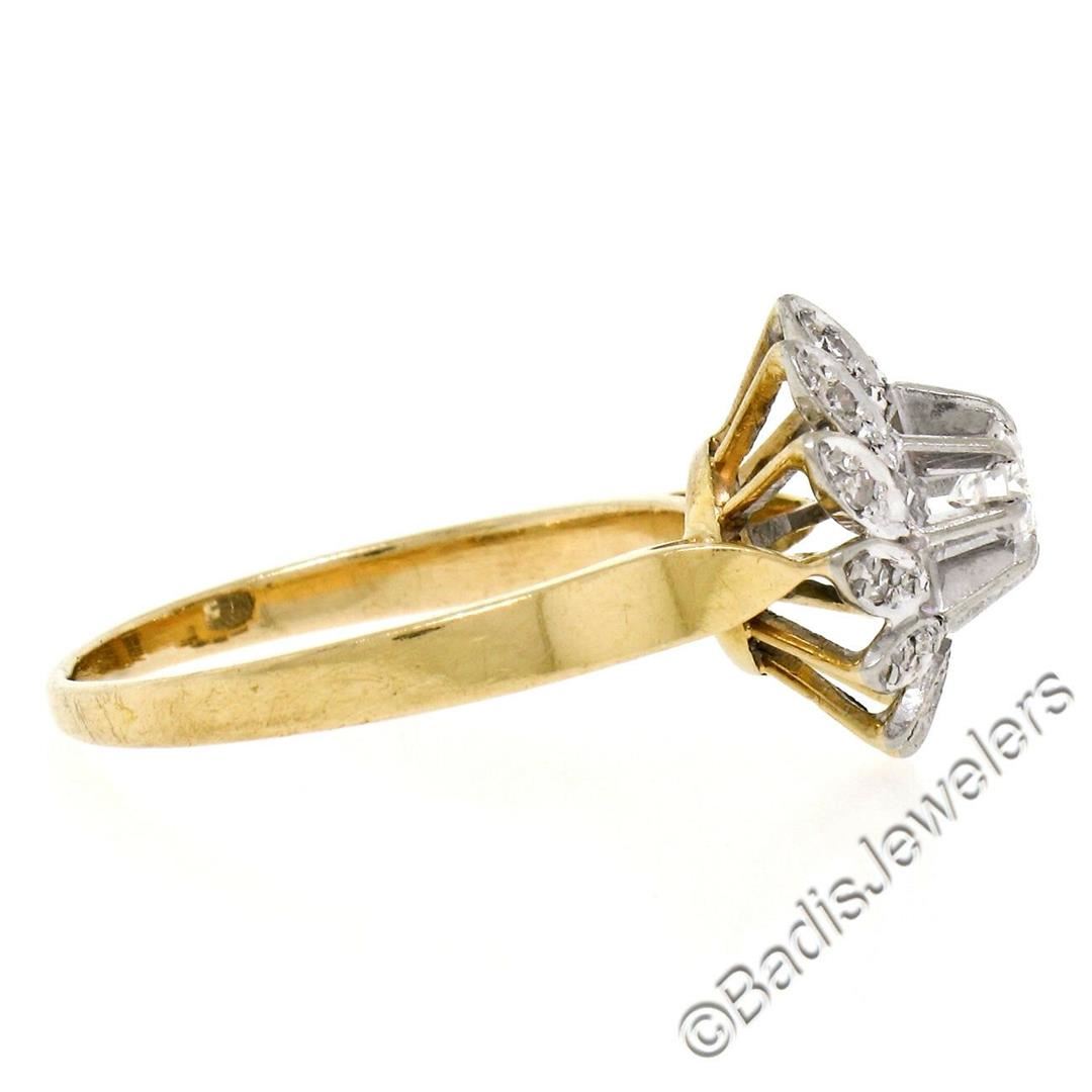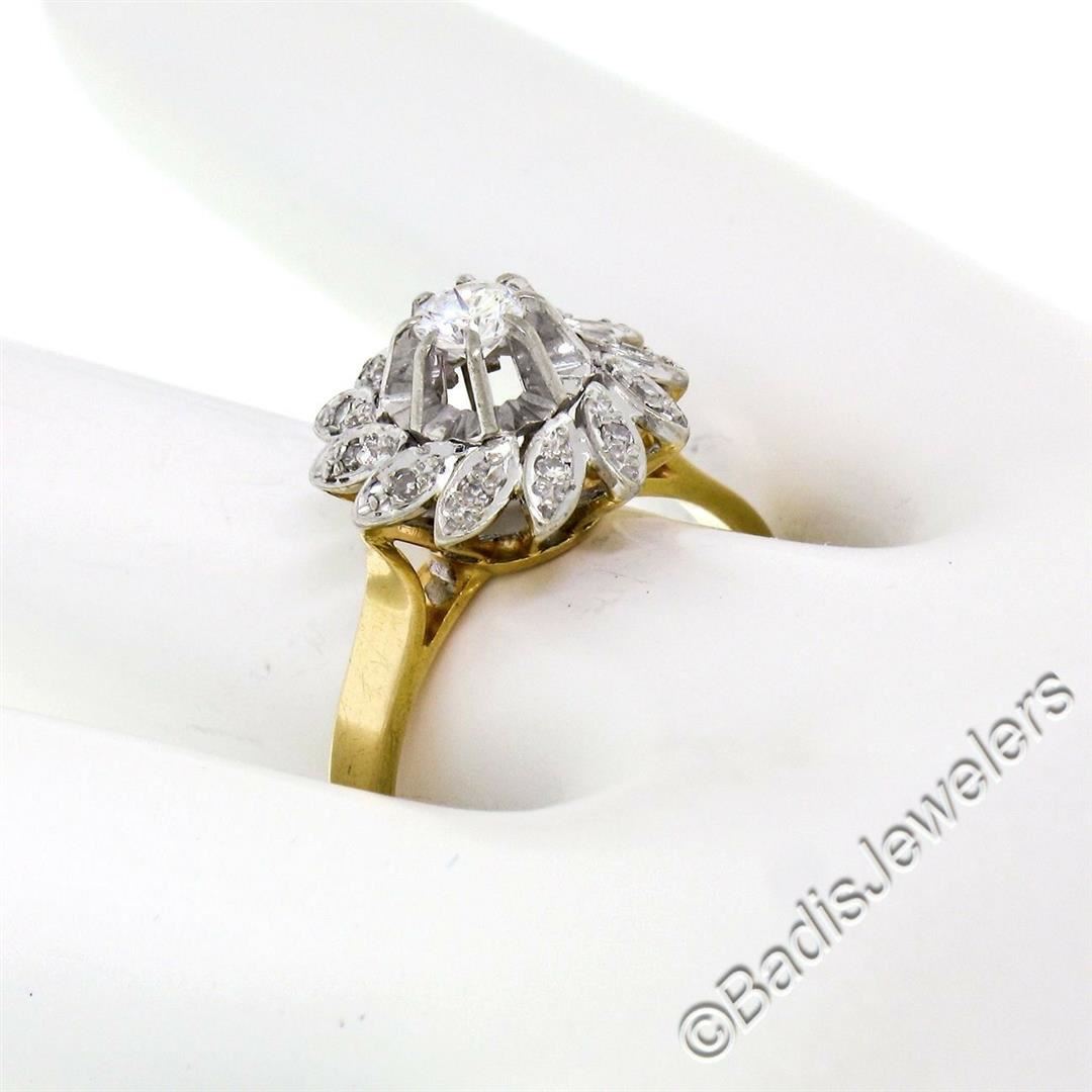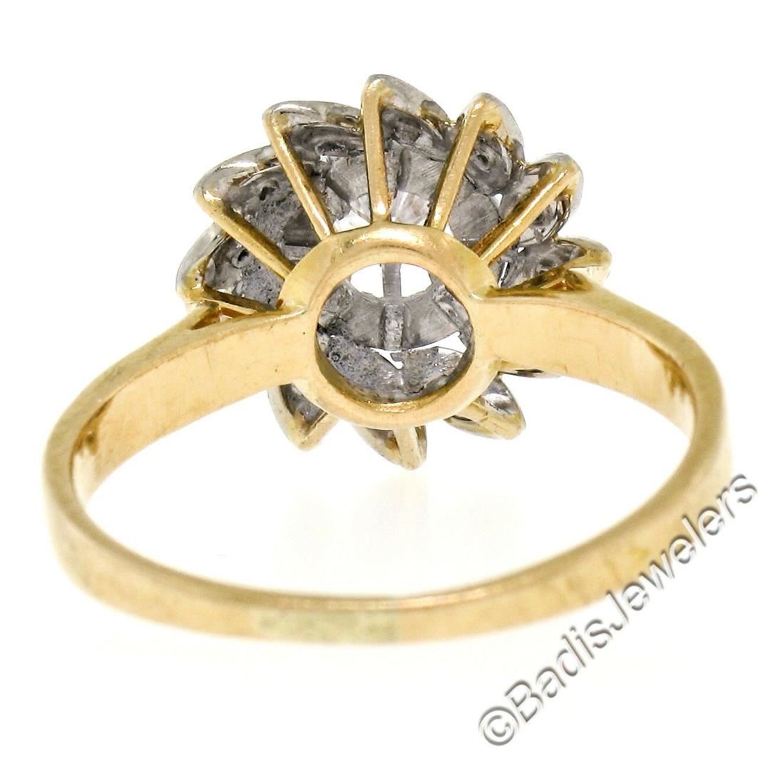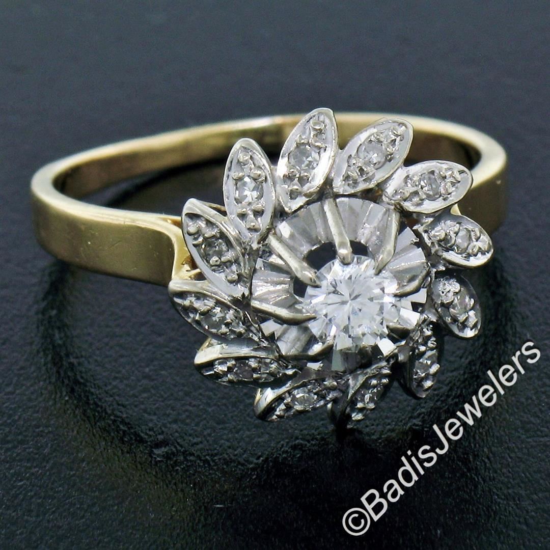 A vintage 18kt yellow and white gold flower cluster ring with a 0.20ct round transitional cut diamond (E - VVS2) solitaire surrounded by 0.18ctw of round single cut diamonds (F/G - VS2). The ring is size 7.5, weighs a total of 3.76 grams, and measures 13.35mm wide.