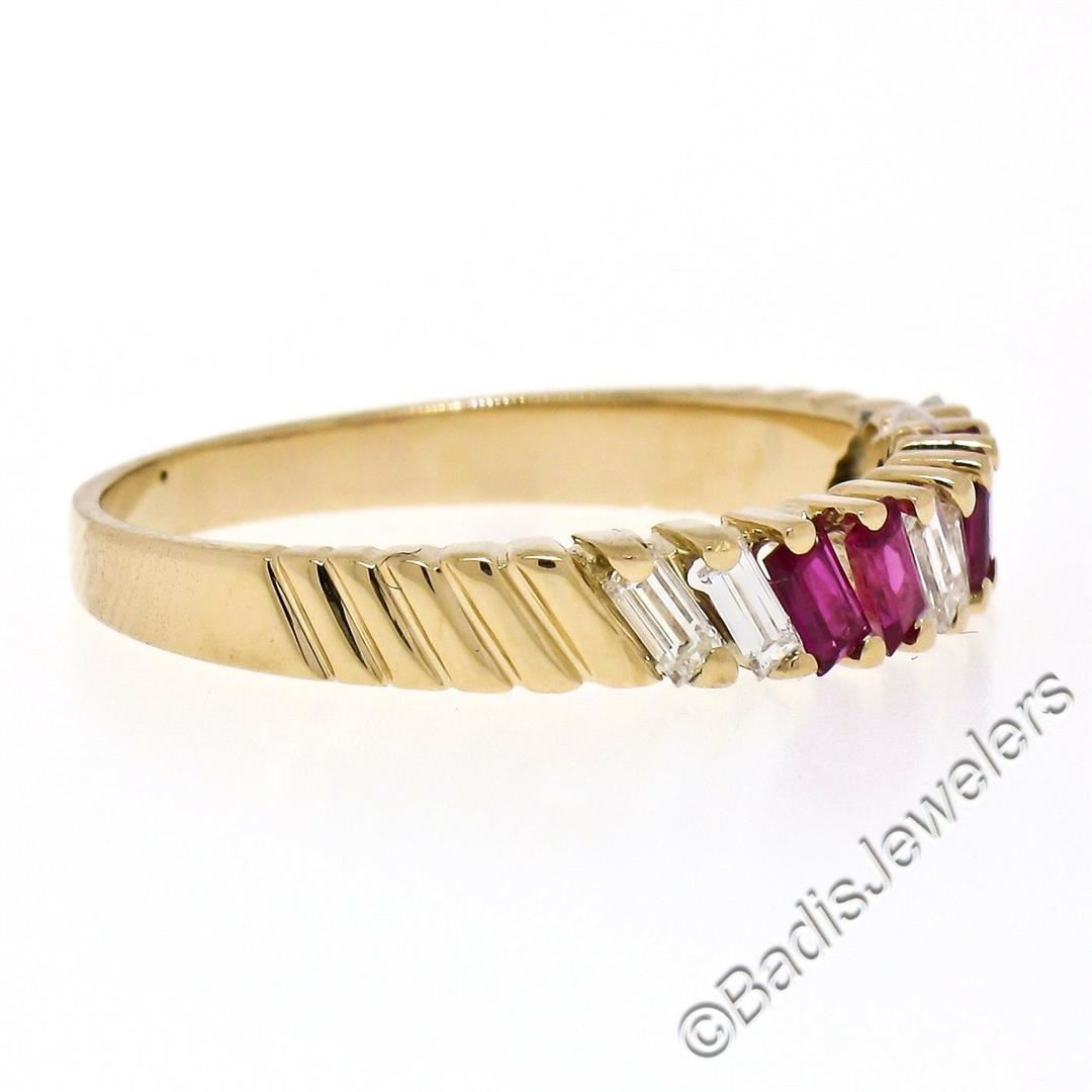 A like new vintage 18kt yellow gold band ring with 0.40ctw of baguette diamonds (F - VS1) and 0.35ctw of baguette rubies. The ring is size 7, weighs a total of 2.54 grams, and measures 3.70mm wide.