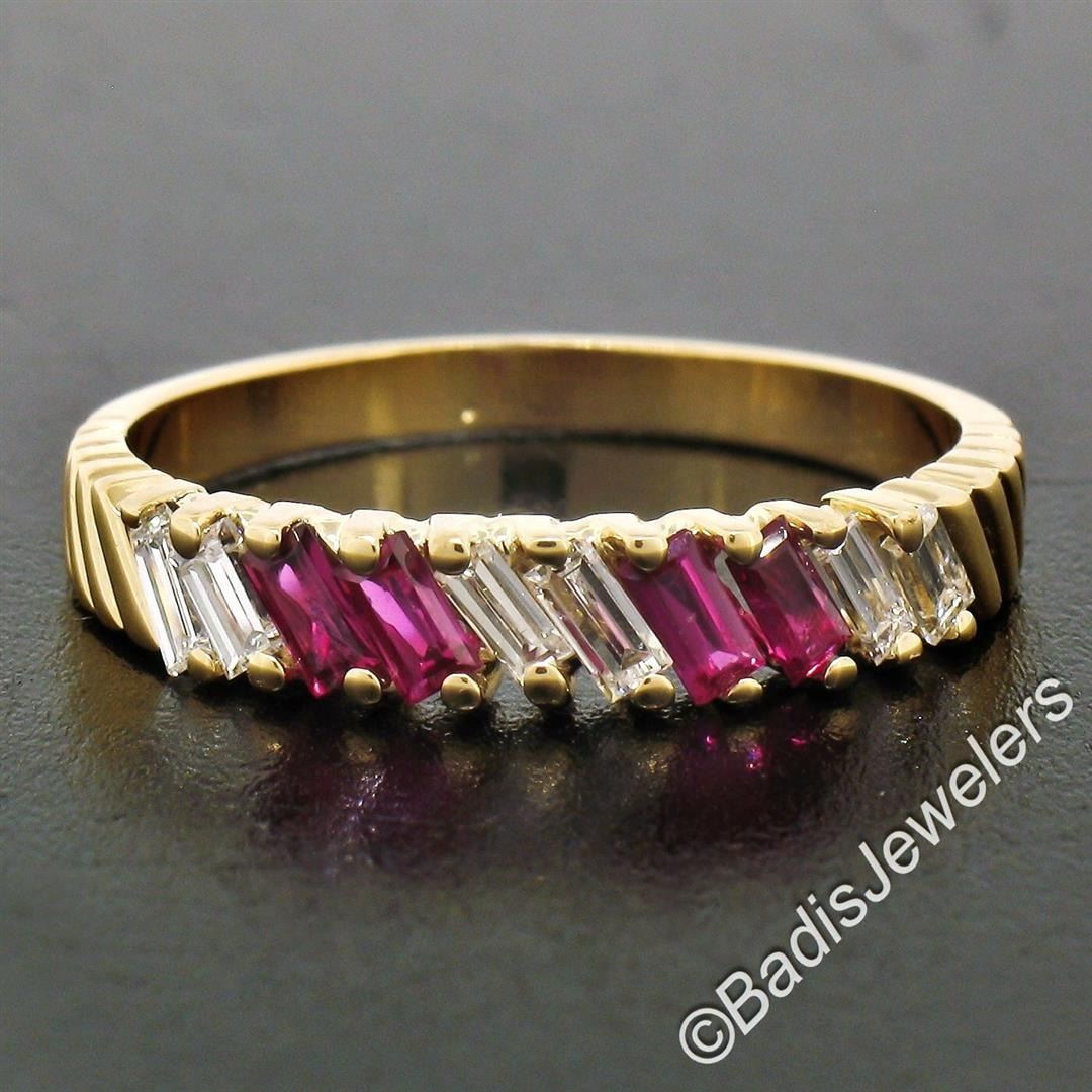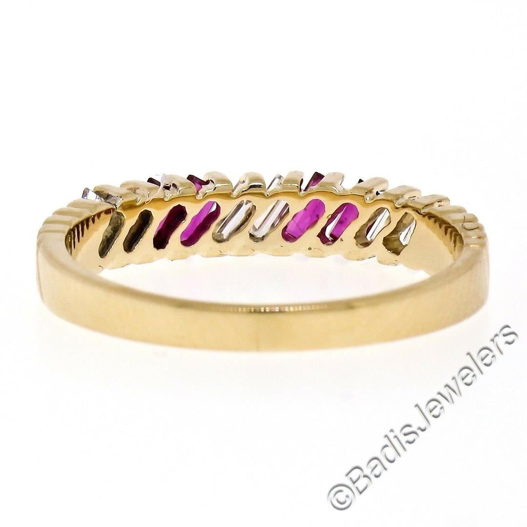 A like new vintage 18kt yellow gold band ring with 0.40ctw of baguette diamonds (F - VS1) and 0.35ctw of baguette rubies. The ring is size 7, weighs a total of 2.54 grams, and measures 3.70mm wide.