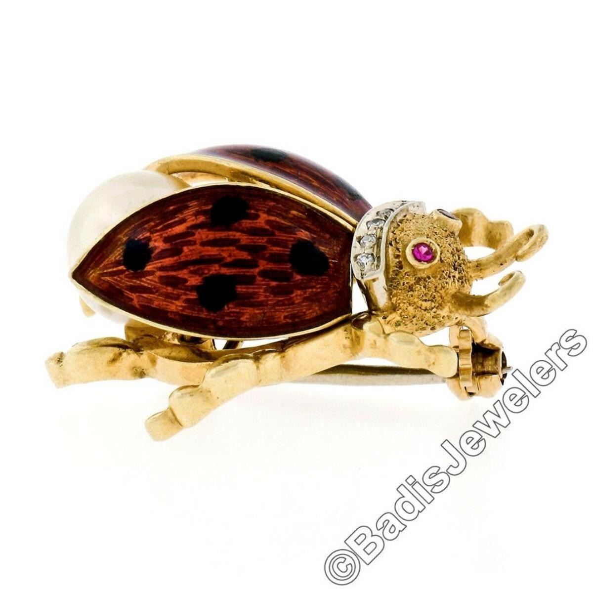 A vintage 18kt gold ladybug pin/brooch featuring red and black enamel, 2 round cabochon rubies (0.02ctw) for eyes, 5 round single cut diamonds (0.03ctw; G - VS2), and an 8.0mm round cultured pearl. Measures 28.0x21.8mm and weighs a total of 8.86 grams.