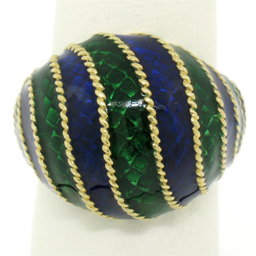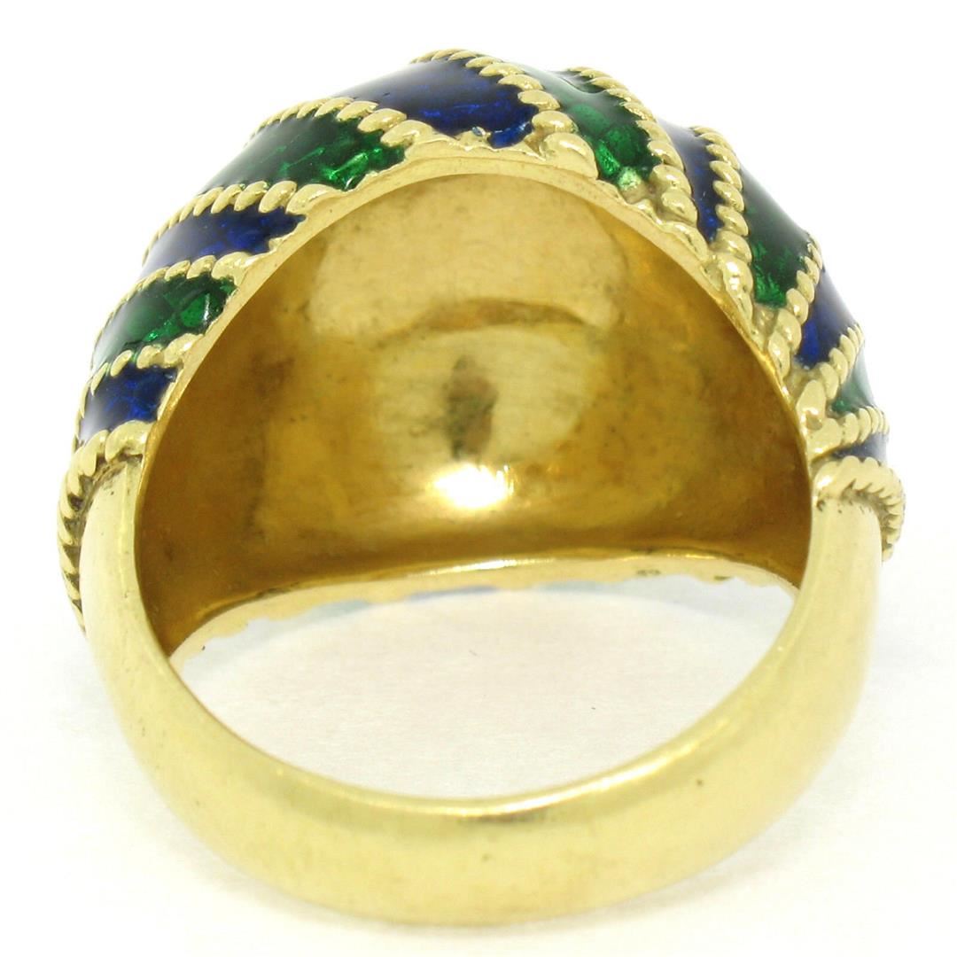 An excellent condition vintage 18kt yellow gold domed ring with striped sections of blue and green enamel. The ring is size 7, weighs a total of 11.57 grams, and measures 17.65mm wide.