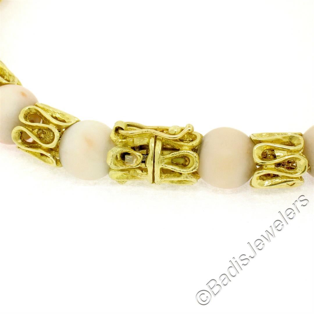 An excellent condition vintage 18kt yellow gold chain bracelet with 8mm round coral beads. It weighs a total of 30.39 grams, measures 8.3mm wide, and measures 7.5 inches long.