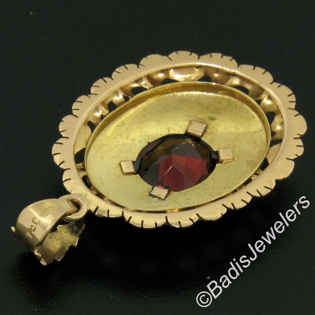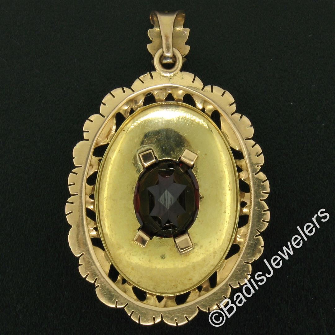 An excellent condition vintage 18kt gold pendant with a 3.42ct oval cut garnet prong set over a yellow gold centerpiece that is surrounded by an open rose gold frame which is accented by four white gold flowers. The pendant weighs a total of 6.47 grams, measures 44.95x27.50mm including the bail, and the inside of the bail measures 7.8x6.3mm.