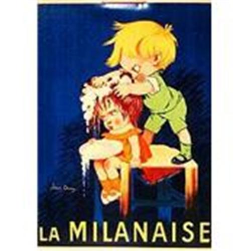 LA MILANAISE SHAMPOO CARDBOARD SIGN 1930, 12? x 16?, cardboard, French, boy washing his scowling sister?s hair - two wholes at top with a red string for hanging, John Onwy's signature printed on bottom