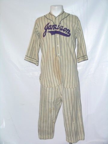 From New York costume designer Frankie Stein, this is a custom made vintage 1930s baseball uniform costume. Swing for the fences with white and blue pinstriped pants, and a white and blue pinstriped shirt with white buttons. The name, "Janison" is printed on the front in cursive. Ms. Stein's work has been featured on stage, television, film & print, and she successfully owns and operates "Frankie Steinz" costume shop in New York. As a freelance costume designer, she later moved her business to New York City where her many clients include ABC, Sony, Disney and HBO, and celebrities Robert De Niro, Billy Joel and Dolly Parton, to name a few. Her work has been featured in The New York Times, Time Out magazine and People Online, and has been seen on The David Letterman Show, The View, Saturday Night Live, The Rosie O'Donnell Show, and Everybody Loves Raymond, and she is credited on the major Academy Award winning film 'Eternal Sunshine of the Spotless Mind.'