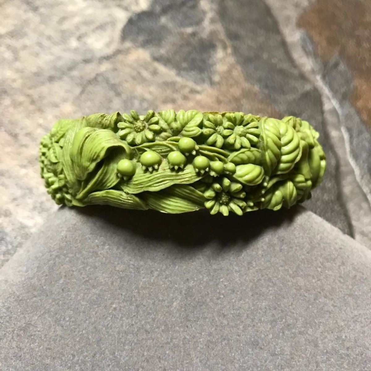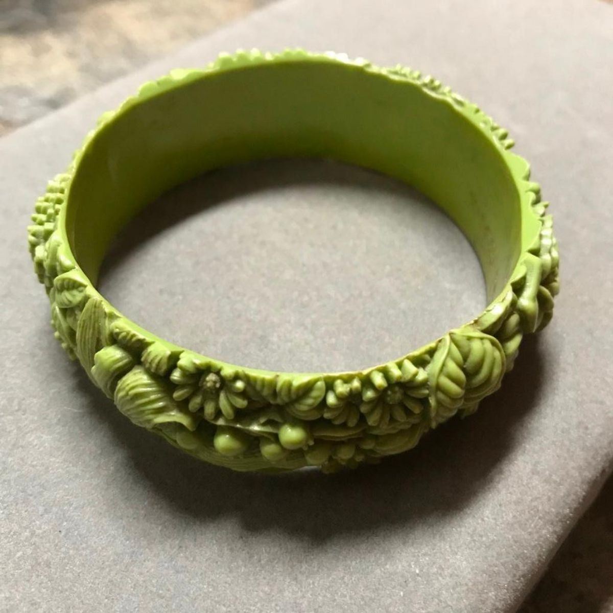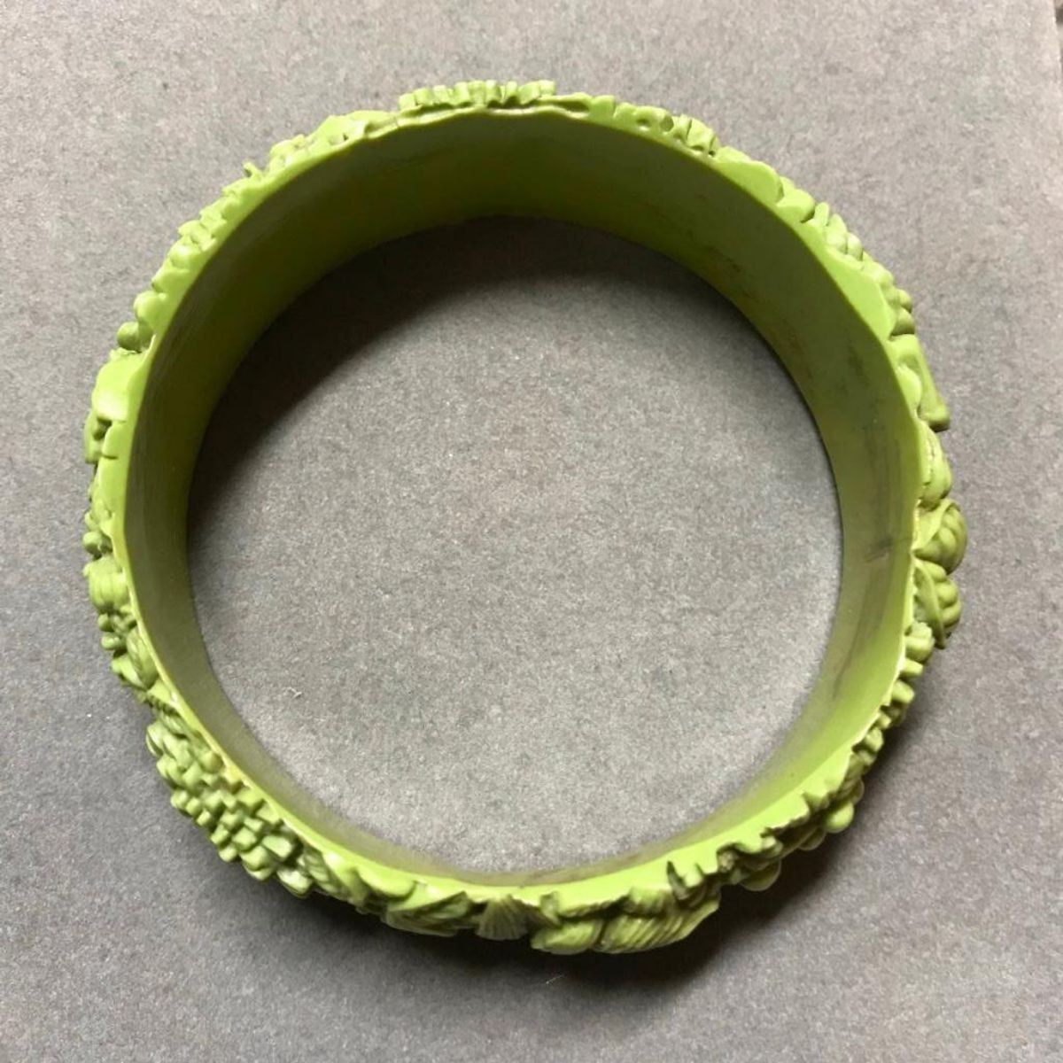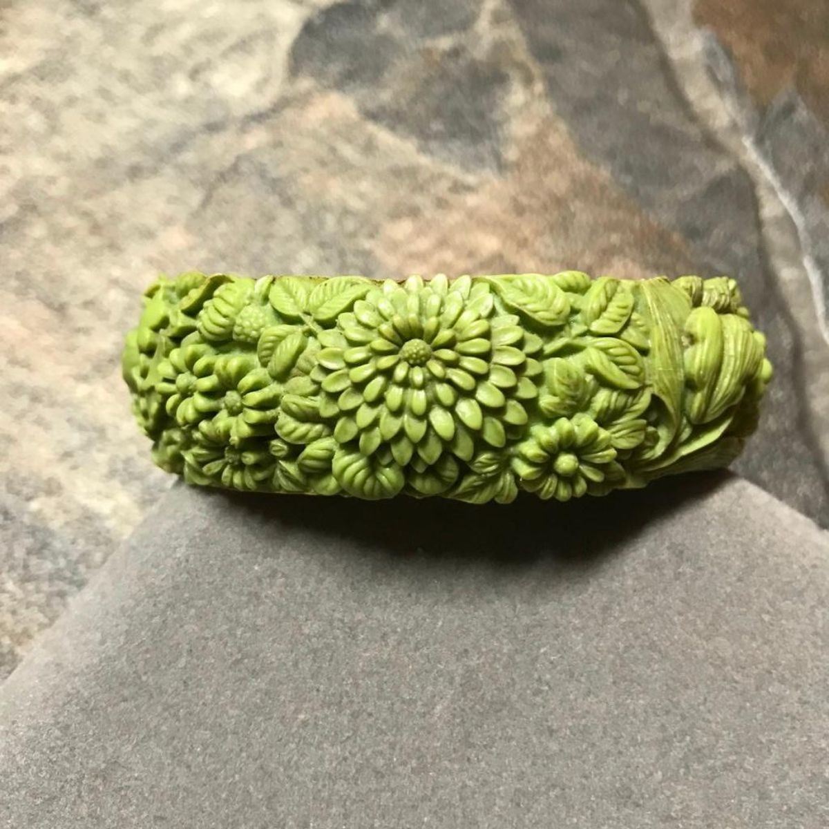 Vintage 1930's molded celluloid floral design green bangle bracelet. 3" D. Celluloids are a class of compounds created from nitrocellulose & camphor, with added dyes & other agents. Generally considered the first thermoplastic, it was first created as Parkesine in 1856 & as Xylonite in 1869, before being registered as Celluloid in 1870. Celluloid is easily molded & shaped, & it was first widely used as an ivory replacement. The main use was in movie & photography film industries, which used only celluloid film stock prior to the adoption of acetate safety film in the 1950s. Celluloid is highly flammable, difficult & expensive to produce & no longer widely used, although its most common uses today are in table tennis balls, musical instruments, & guitar picks.