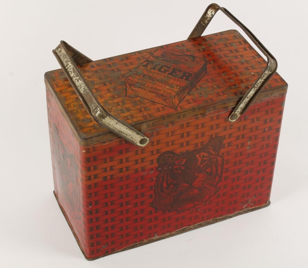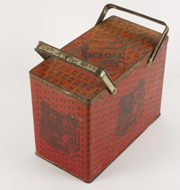 Has a hinged lid advertising "TIGER" Bright Sweet Chewing Tobacco, made by P Lorillard Co. There is a scrape page from a Newspaper on the bottom of the contain, titled, Kansas City Daily Drovers Telegram Monday, April 1, 1935. Container measures 7 3/4"Hx10"Wx5 1/2"D.