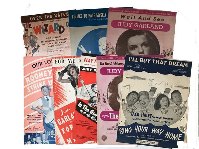 A collection of vintage music sheet including songs from the movies Sing Your Way Home, Judy Garland’s The Harvey Girls, In The Good Old Summer Time, For Me and My Gal, Our Love Affair, I’d Like to Hate Myself in the Morning, and the Wizard of Oz. All from the 1930s to 1940s.
