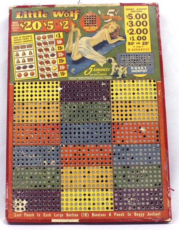 Vintage 1940 Little Wolf Punch Board Game, measures 12''W x 17''L, has been punched, back reads: Filled by: 936 Serial No. 3892 Style 11J22 Color: Russet, does not include punch