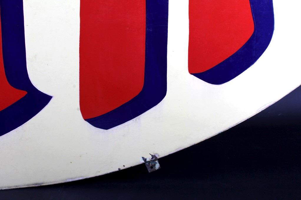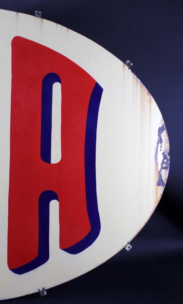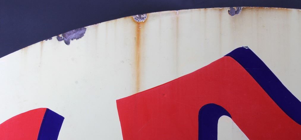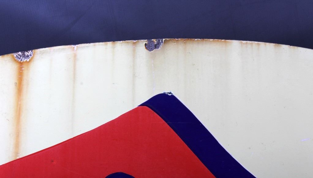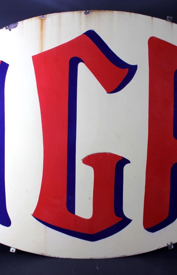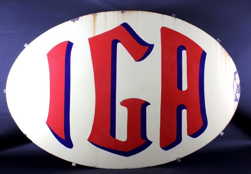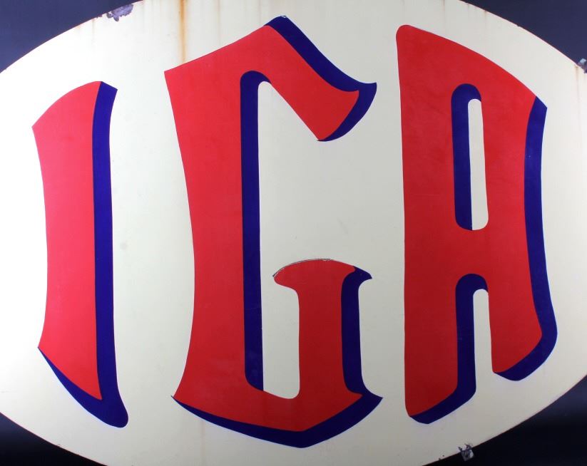 This lot features a vintage circa 1940s porcelain IGA grocery store sign. IGA was founded in the United States as the Independent Grocers Alliance. The headquarters is in Chicago, Illinois. IGA was started in May 1926 when a group of 100 independent retailers in Poughkeepsie, New York, and Sharon, Connecticut, led by J. Frank Grimes, organized themselves into a single marketing system. The porcelain sign is off one of there member stores. It is in good condition for its age. Measures: 48" H x 72" W