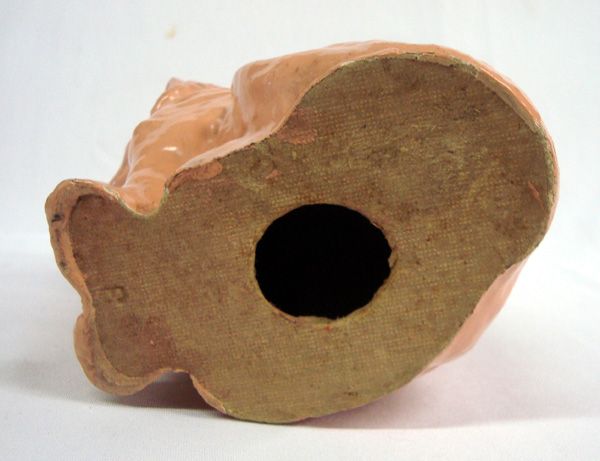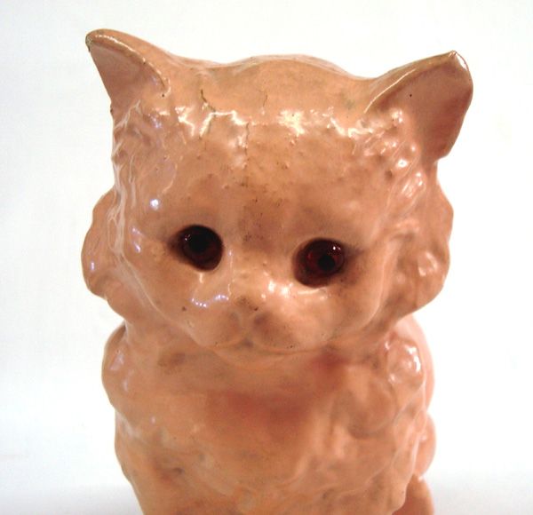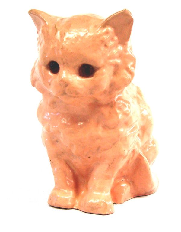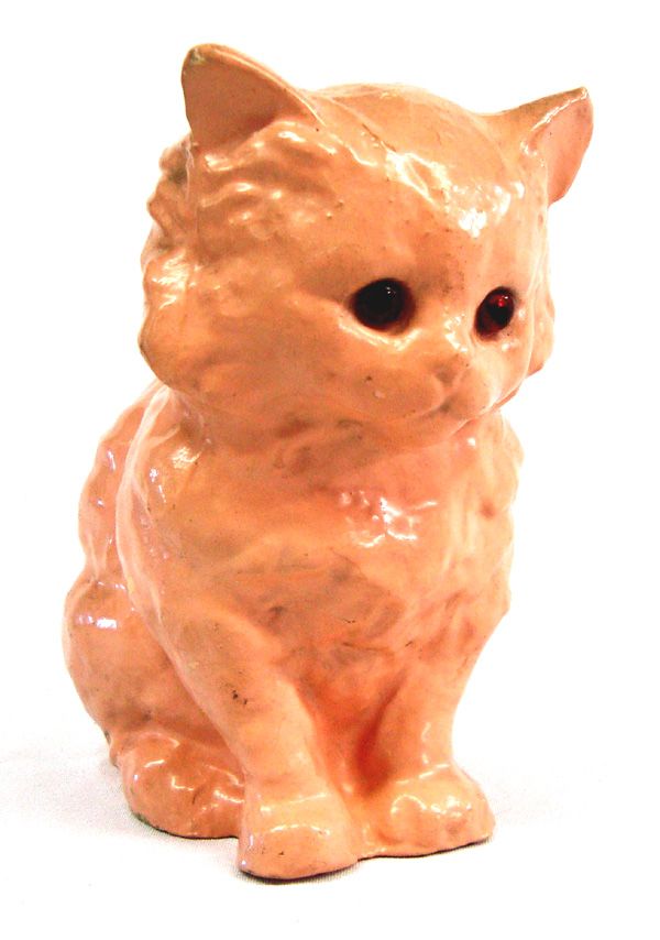 Vintage 1940's Paper Mache Cat with glass eyes. Pale pink in color. Measures 4.25'' W x 5.25'' L x 6.5'' H.