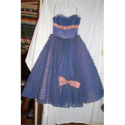 <tr><td>Title:Vintage 1948 Blue & Pink Ruffle Prom Dress</td></tr>