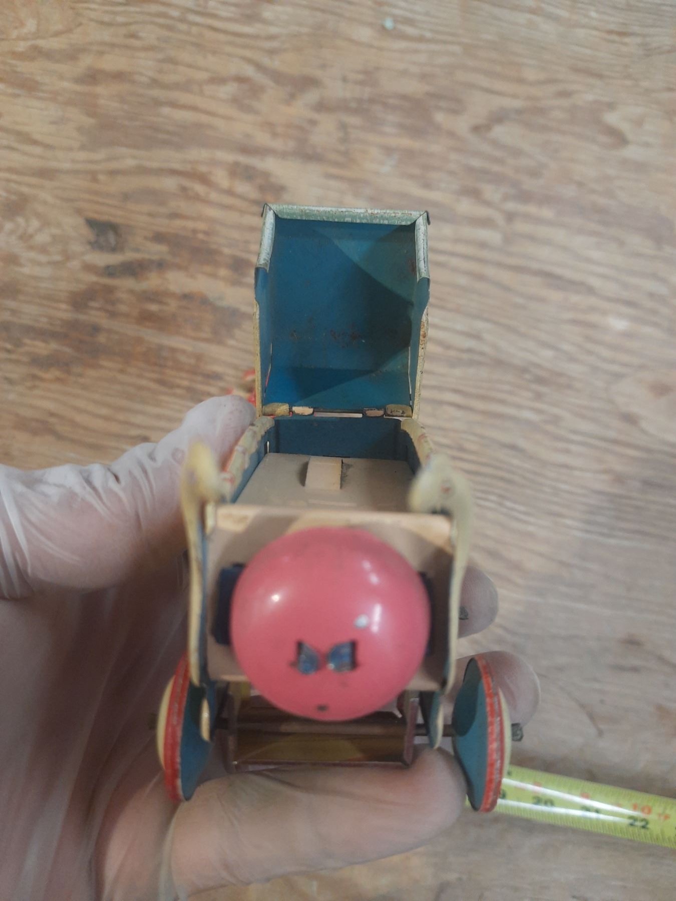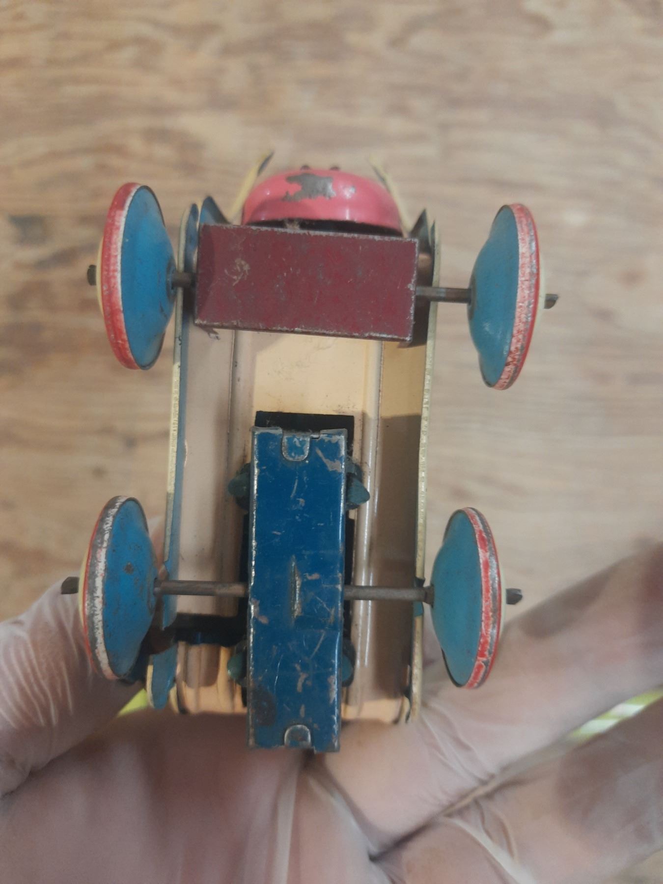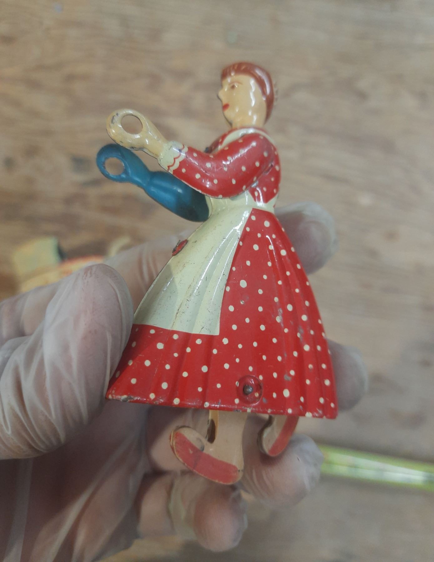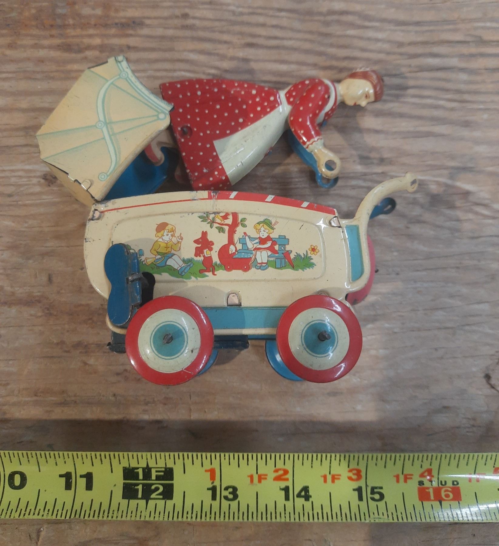 Vintage 1950's Hasitin Litho wind up red mother pushing a carriage. (Working) Rare.