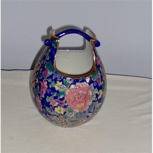 The primary aspect of this basket vase is its handle. Moving upward from the large bowl, the two sides are pinioned by a separate cobalt-glazed handle which gives the looped-together, or "cinched" effect. The vase is 8 inches tall and 5 3/4 inches wide at its widest point. It has a 3-inch base. The "scoop" on each side due to the looping together of the sides is 3 1/2 inches deep; the top handle is 4 1/2 inches long. The handle itself is 1/2-inch thick. The walls of the vase are 1/4-inch thick on the sides.<p>