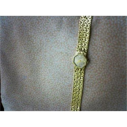 Octagan 14K Gold ladies wrist watch by Geneva (Swiss made 17 jewels). Watch band 1/2" wide clasp are also heavy 14K Gold beautifully made and very flexible. Excellent running condition. Overall length of watch and band is 7".