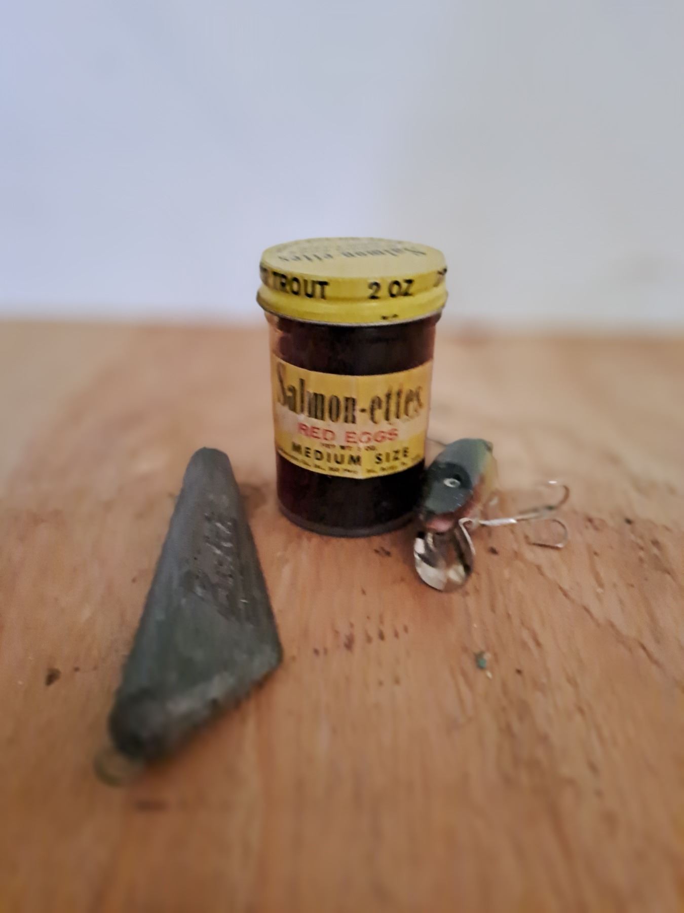Vintage 1960's Salmon-ettes milking eggs non-toxic, Great for trout, stil has eggs in the jar, Vintage 01 Bulch sinker, vintage fishing lure
