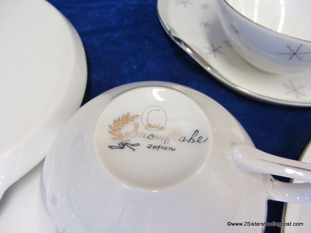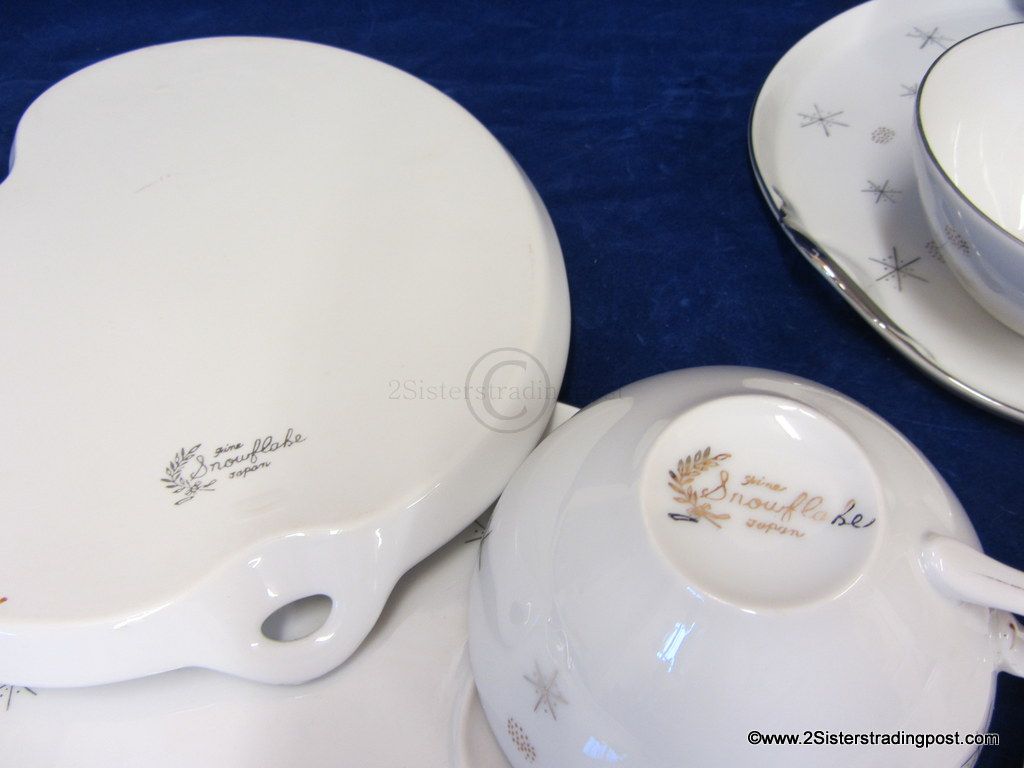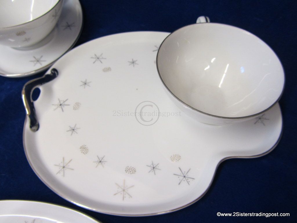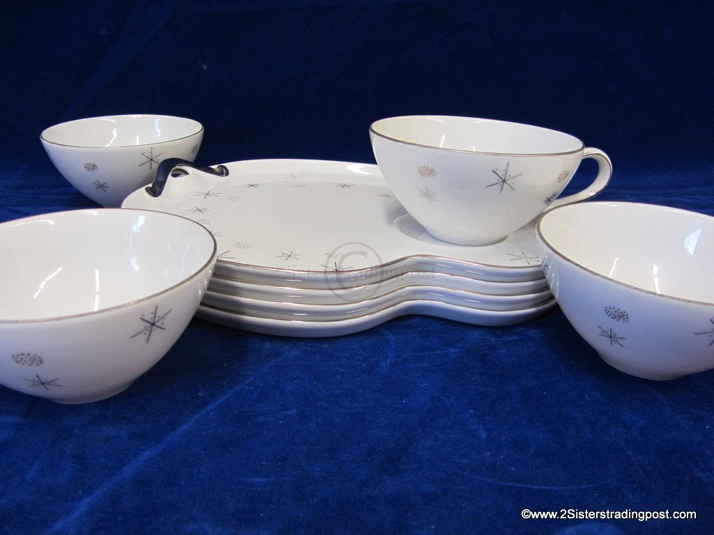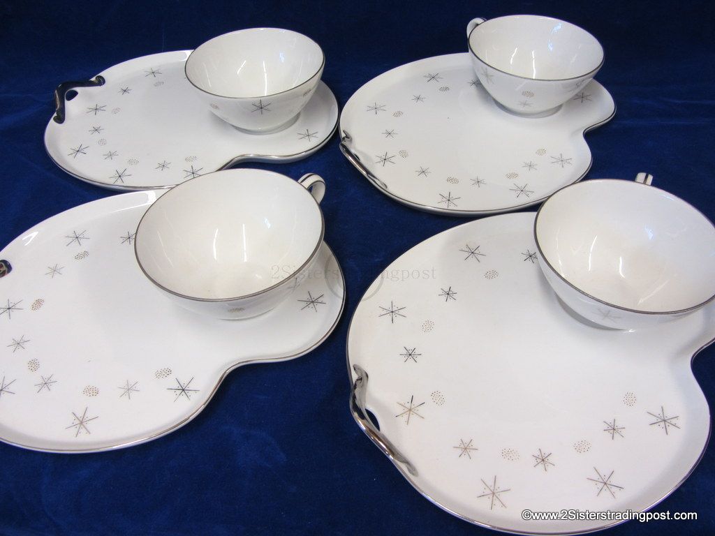 This is a fine set of vintage 1960's snack plates with matching tea cups. Although they are 50 years old the design is very modern and would work with almost any design concept. They have silver star/snowflake pattern with matching silver trimmed edges and rims. The plates are designed in a very stylish elongated design allowing plenty of room for your figure food needs. Plates are 9" long x 7.5" wide and cups are 2" tall x 4" across. The bottoms of the plates have a matt finish to help prevent slipping. The color on this set is clear and shows little to no wear. You are bidding on a set of 4 plats and 4 tea cups. This set is marked Fine Snowflake Japan(cup and plate $8.99 on Replacements.LTD, & $10.25 on Etsy) NOTE: the silver is worn at the very tip oh the handle on each plate (see images for details)