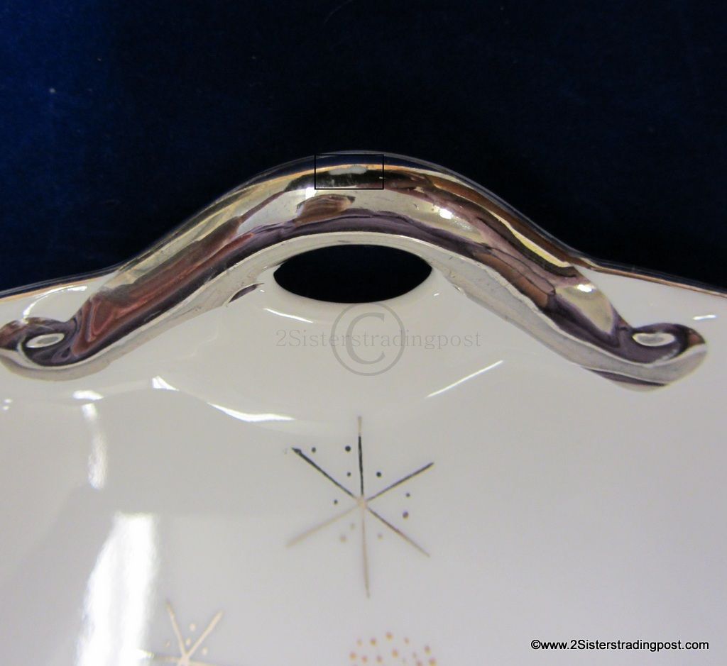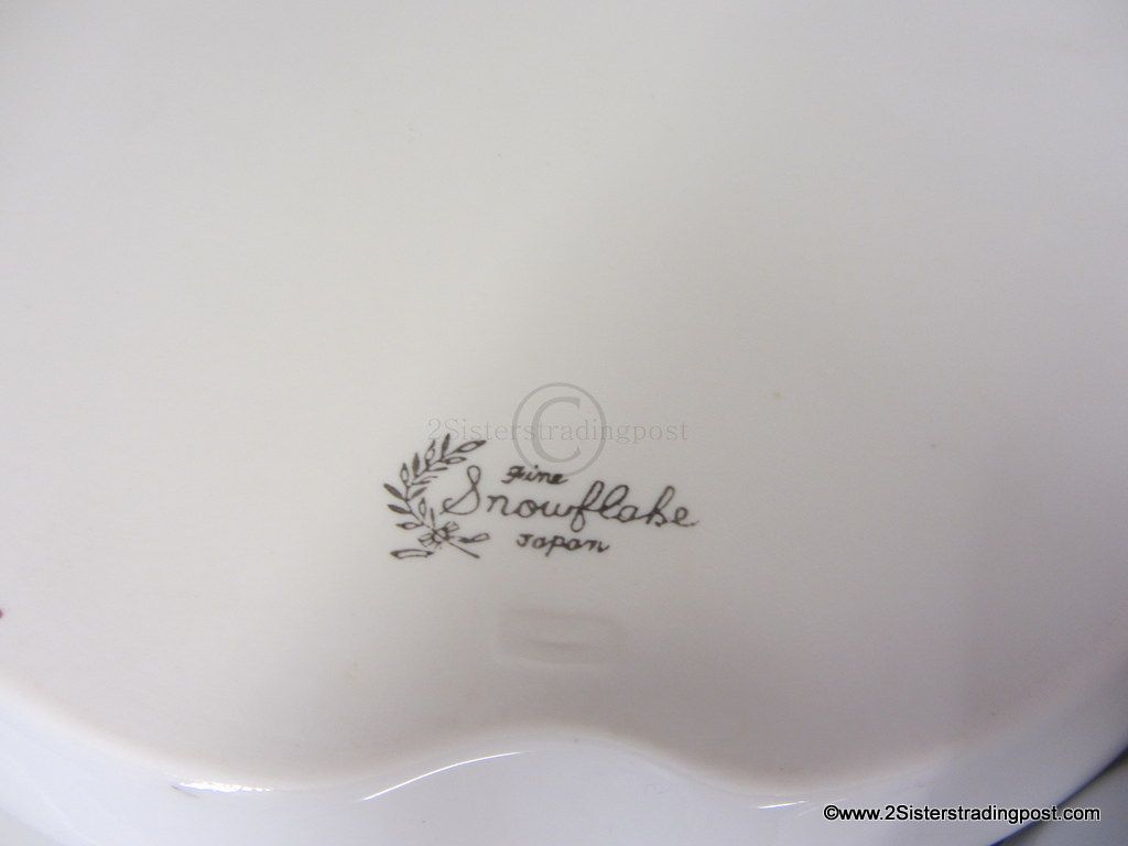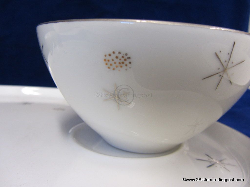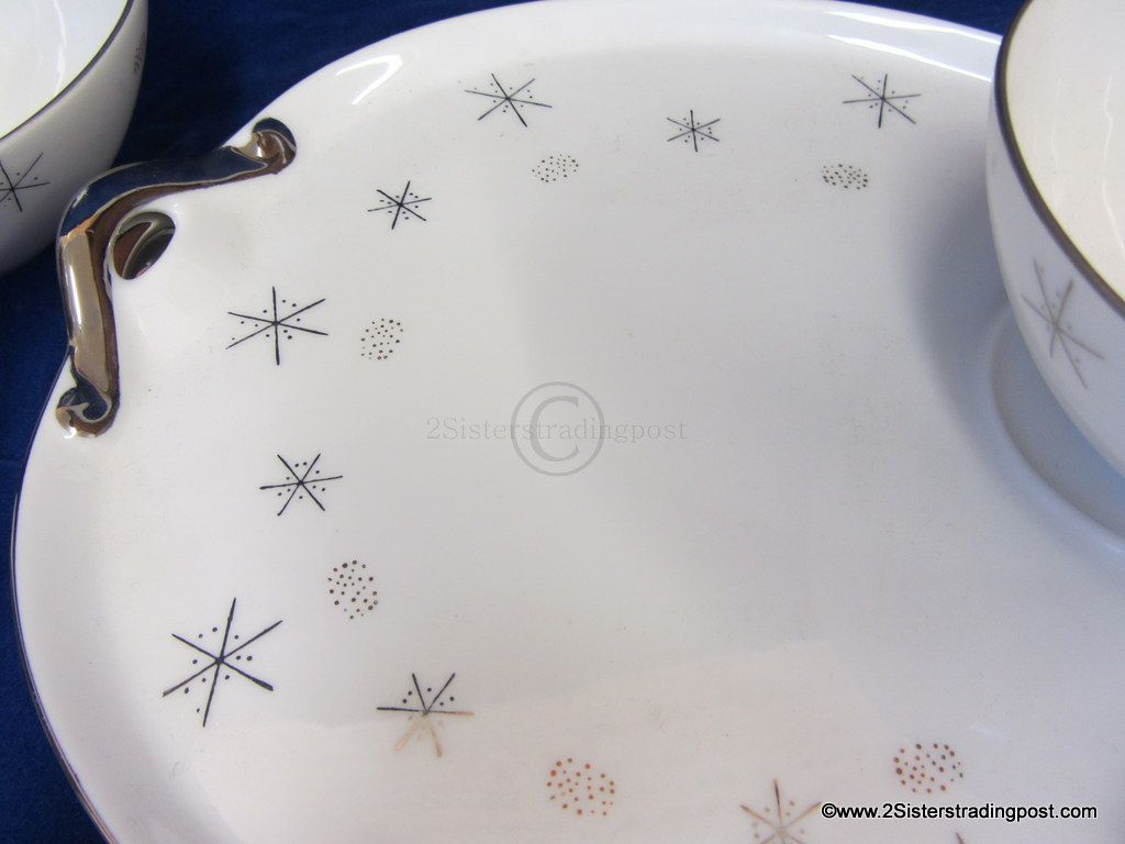 This is a fine set of vintage 1960's snack plates with matching tea cups. Although they are 50 years old the design is very modern and would work with almost any design concept. They have silver star/snowflake pattern with matching silver trimmed edges and rims. The plates are designed in a very stylish elongated design allowing plenty of room for your figure food needs. Plates are 9" long x 7.5" wide and cups are 2" tall x 4" across. The bottoms of the plates have a matt finish to help prevent slipping. The color on this set is clear and shows little to no wear. You are bidding on a set of 4 plats and 4 tea cups. This set is marked Fine Snowflake Japan(cup and plate $8.99 on Replacements.LTD, & $10.25 on Etsy) NOTE: the silver is worn at the very tip oh the handle on each plate (see images for details)