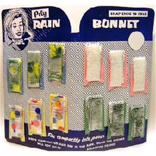 Vintage 1960's Rain Bonnet Counter Display, has 12 assorted bonets on the display, each with its own pouch, great old display that folds to make a nice counter display